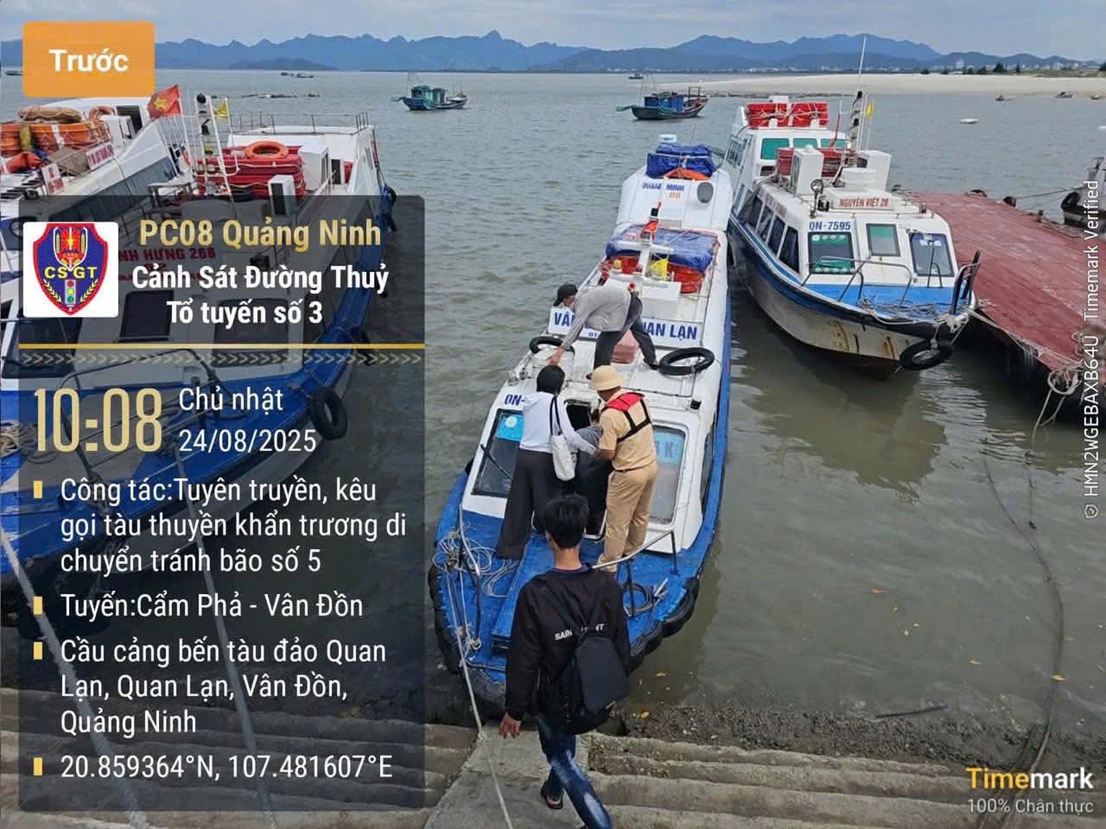 Tại Quảng Ninh, lực lượng Cảnh sát đường thủy Công an tỉnh cũng phối hợp các đơn vị chức năng tuyên truyền, vận động ngư dân chằng buộc phương tiện, lồng bè an toàn, sẵn sàng ứng phó bão số 5 Kajiki.
