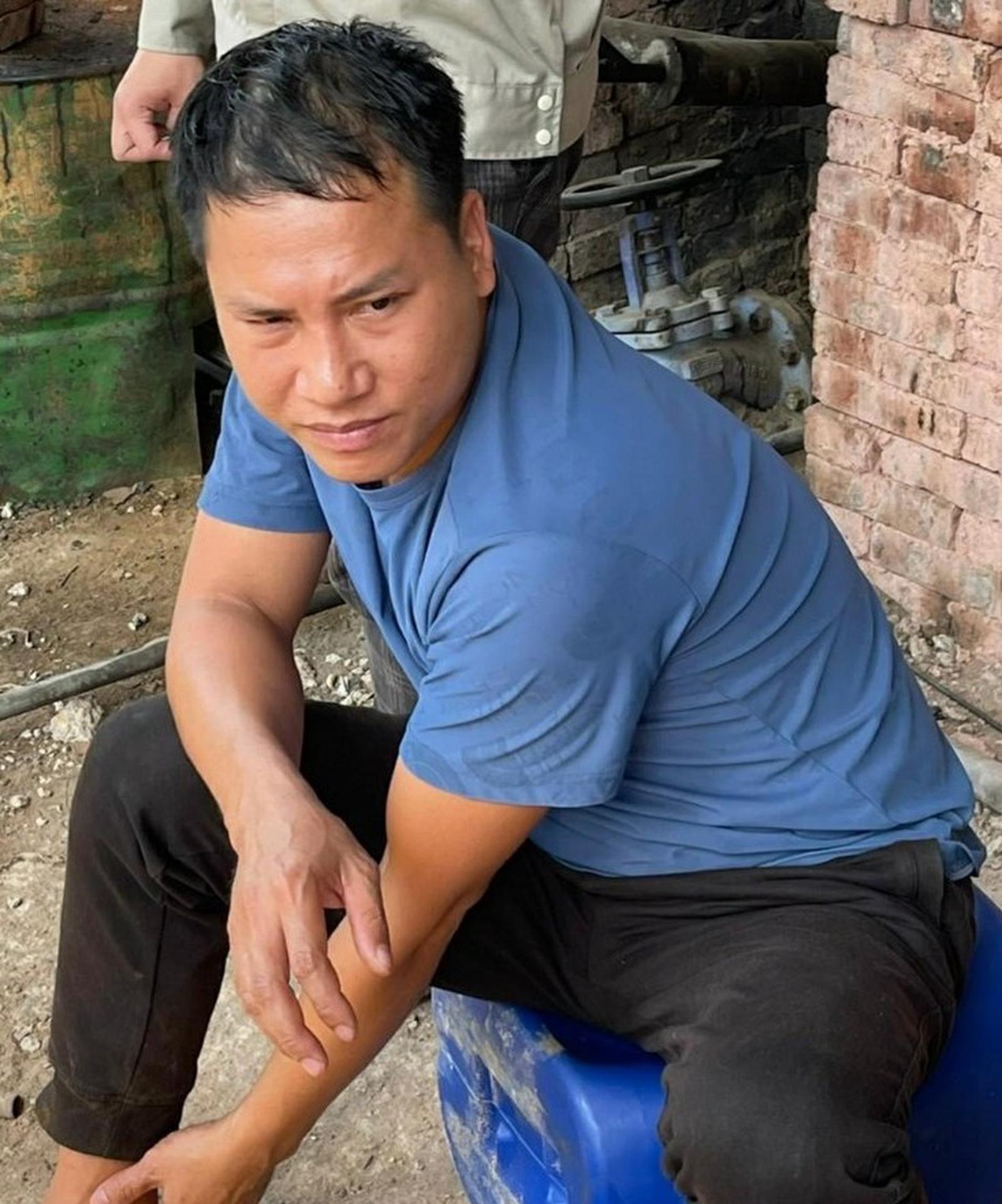Đối tượng Hồ Đức Sỹ tại hiện trường nơi cơ sở tái chế dầu trái phép. Ảnh: MK