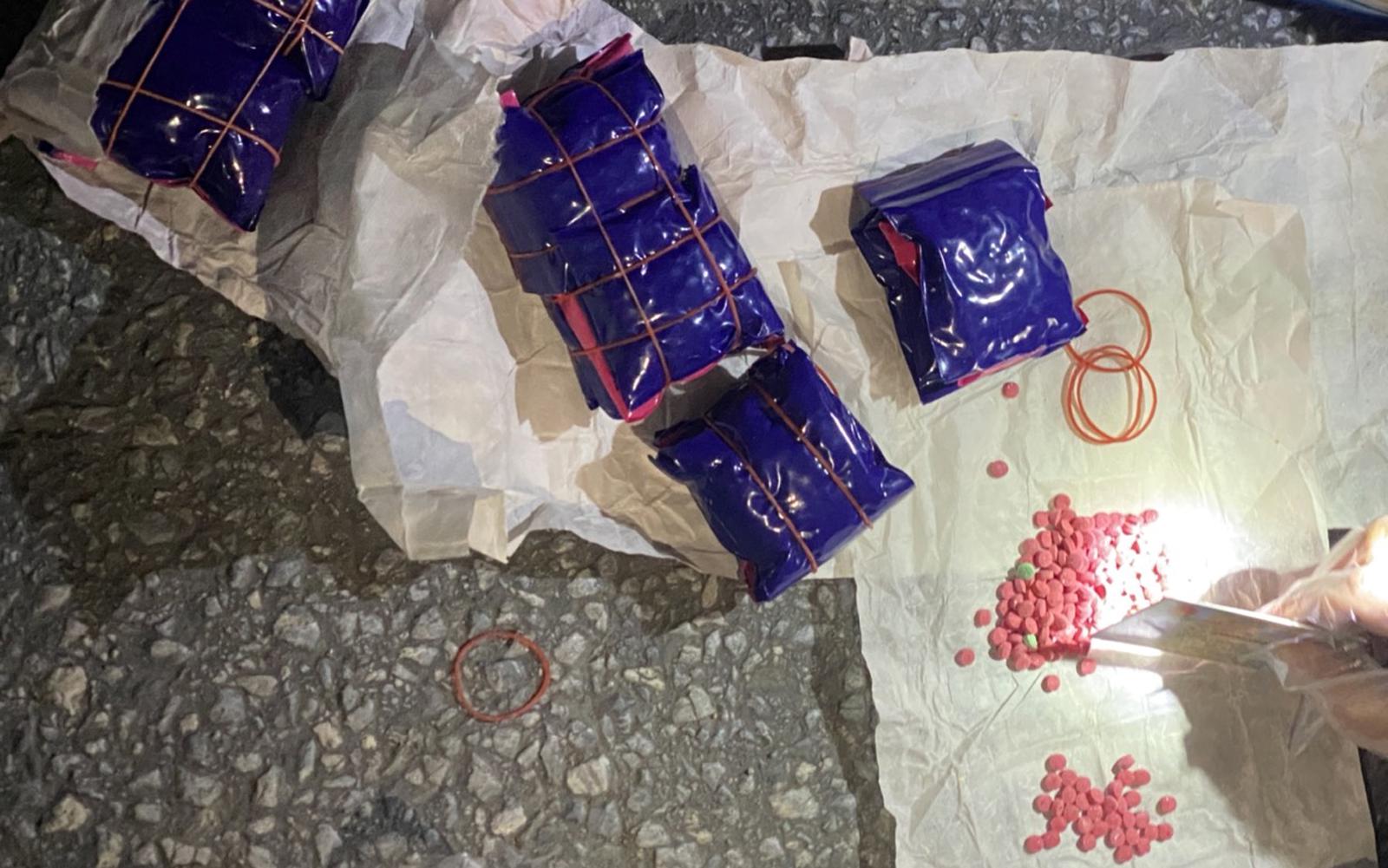 Trong khi tổ công tác đang kiểm tra thì bất ngờ nam thanh niên điều khiển phương tiện lấy từ trong người ra một bọc ni lông ném xuống ven đường. Hành động này đã nhanh chóng bị tổ công tác phát hiện và yêu cầu đối tượng nhặt lên để kiểm tra. Qua kiểm tra, lực lượng chức năng phát hiện bên trong bọc ni lông có 29 gói ni lông chứa 5.858 viên nén màu hồng. Qua giám định, số viên nén trên đều là ma túy tổng hợp (Methamphetamine), có trọng lượng 605,58g.