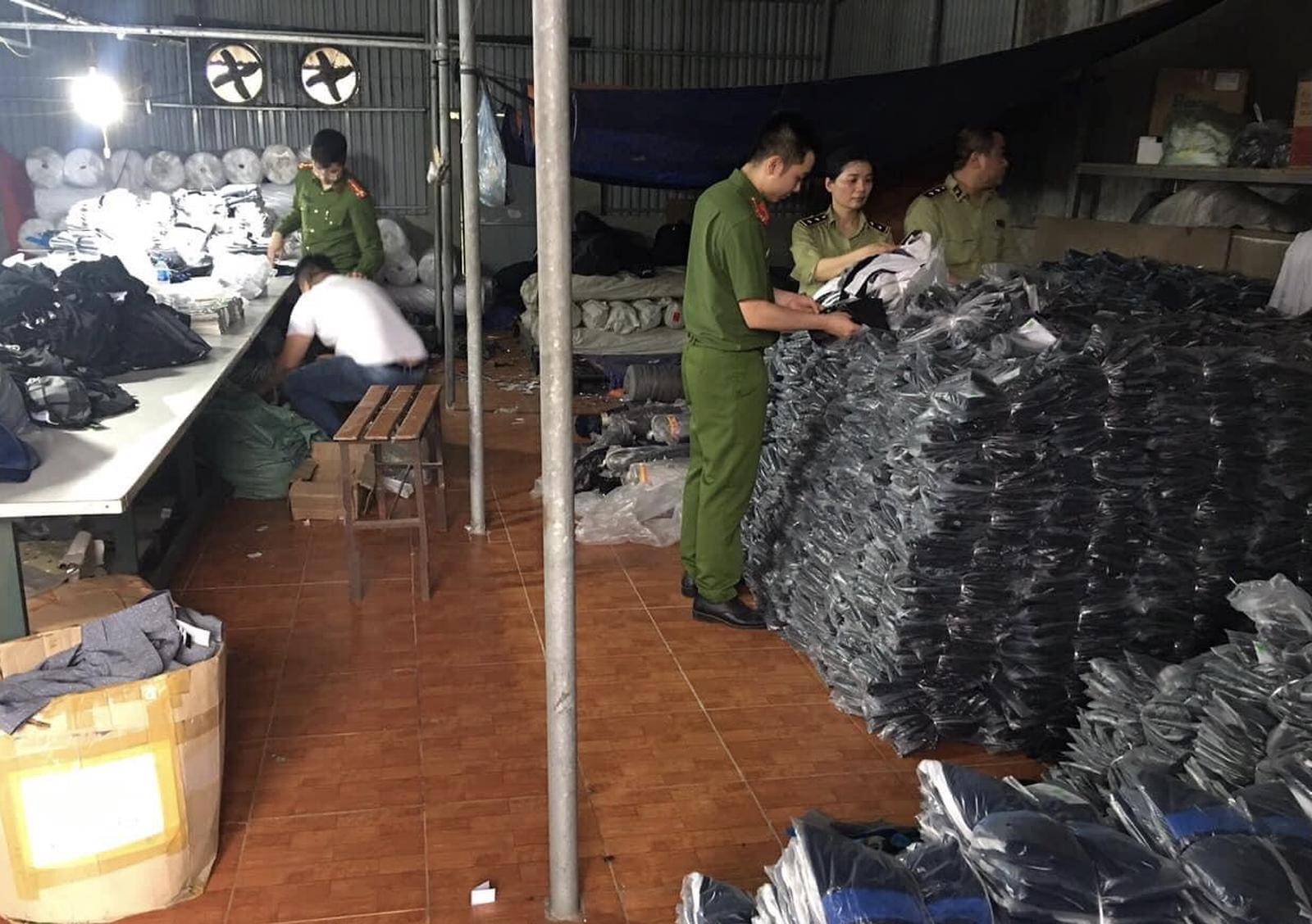 Lực lượng QLTT Hà Nam bắt quả tang xưởng sản xuất hàng thời trang giả mạo nhãn hiệu nổi tiếng. Ảnh: LP