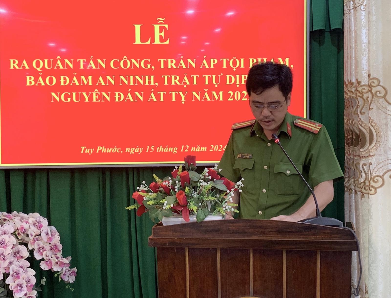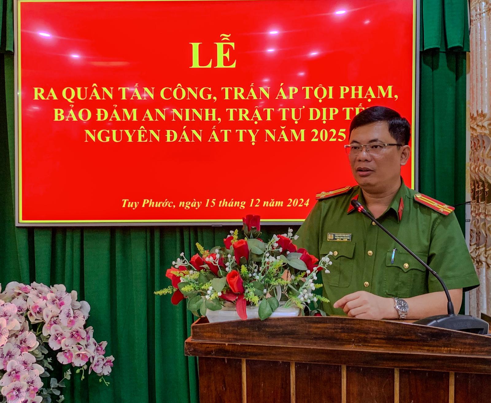 Phát biểu tại lễ ra quân, ông Nguyễn Văn Đây – Ủy viên Ban Thường vụ Huyện ủy, Bí thư Đảng ủy, Trưởng Công an huyện yêu cầu các lãnh đạo Công an huyện, Đội trưởng các Đội Nghiệp vụ và Trưởng Công an các xã, thị trấn phải phát huy vai trò của mình trong công tác lãnh đạo, chỉ đạo thực hiện đạt và vượt các chỉ tiêu đã đề ra trong Kế hoạch tấn công trấn áp tội phạm đem lại cuộc sống bình yên cho Nhân dân vui Xuân đón Tết.