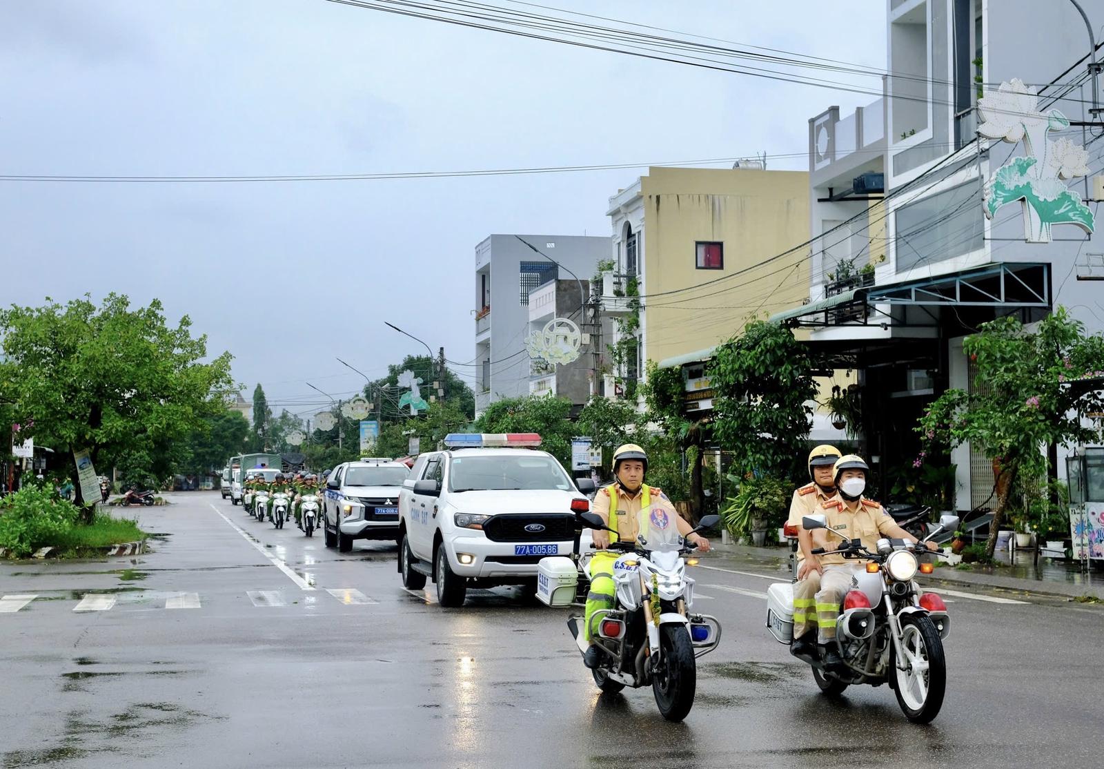 Lực lượng Công an huyện đã ra quân diễu hành trên các tuyến đường chính trên địa bàn huyện Tuy Phước. Ảnh: BT