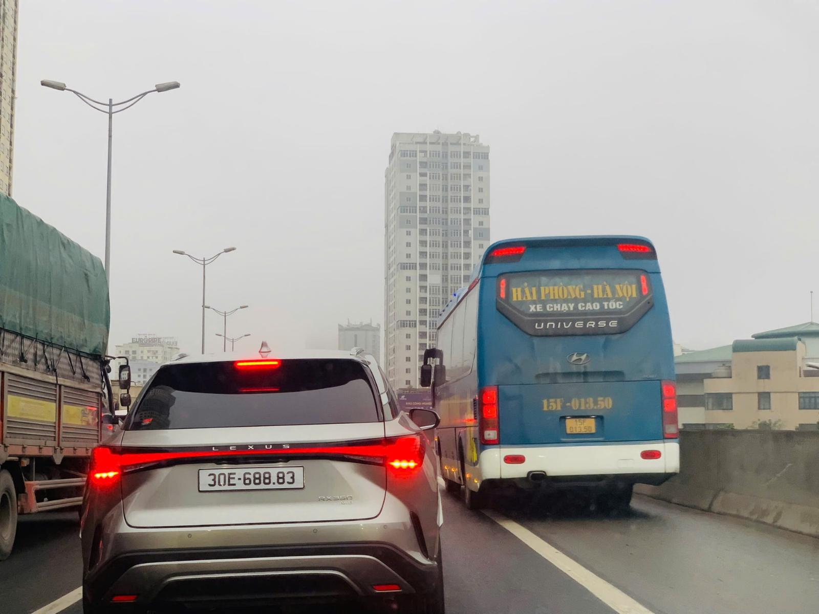 Xe khách biển kiểm soát 15F-01350 đi vào làn dừng khẩn cấp trên đường Vành đai 3 Hà Nội vào sáng ngày 13/3. Ảnh: PV