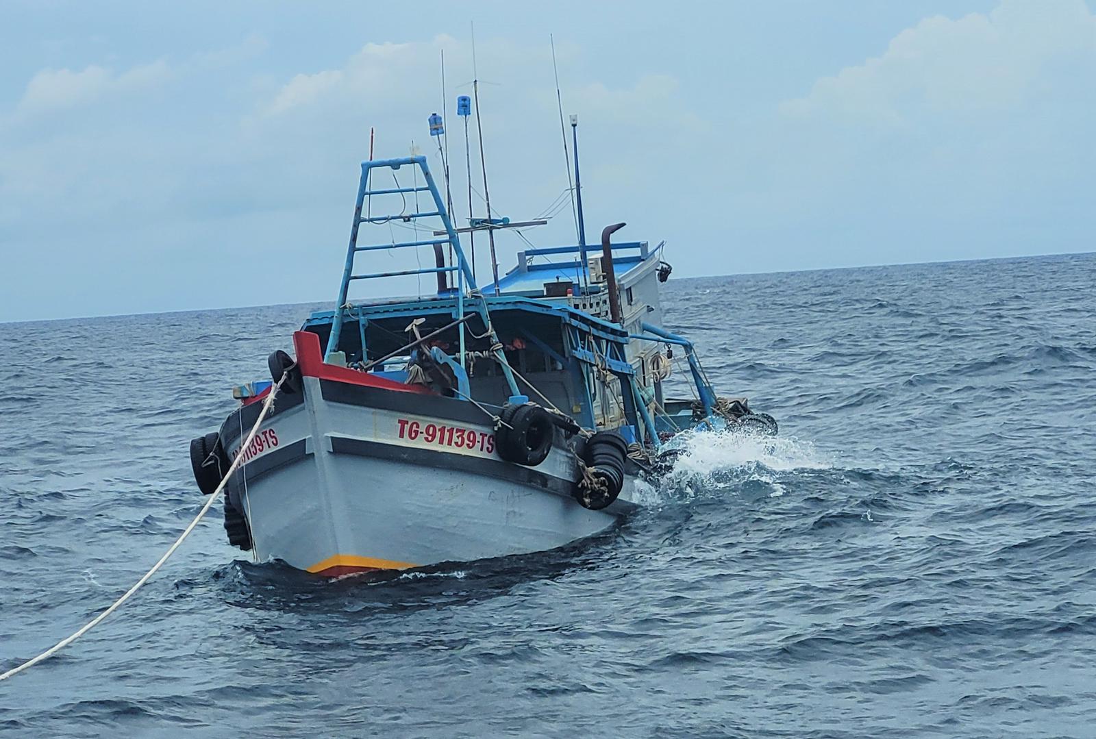 Tàu cá TG 91139 TS trong quá trình dẫn giải. Ảnh: A.X