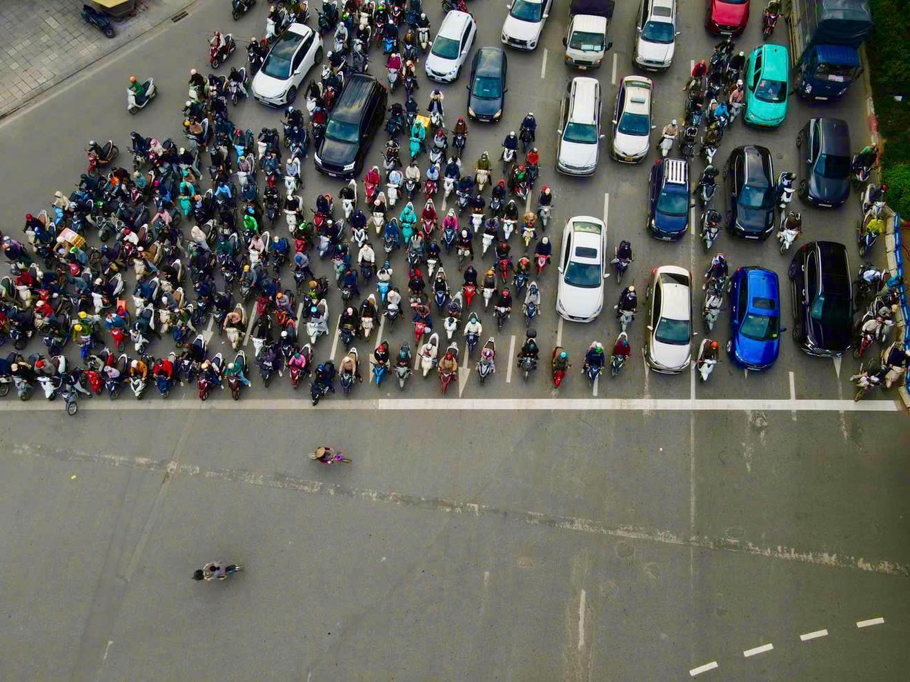 Hình ảnh phương tiện giao thông đồng loạt dừng trước vạch kẻ đường tại một nút giao thông. Ảnh: Ngọc Tiến