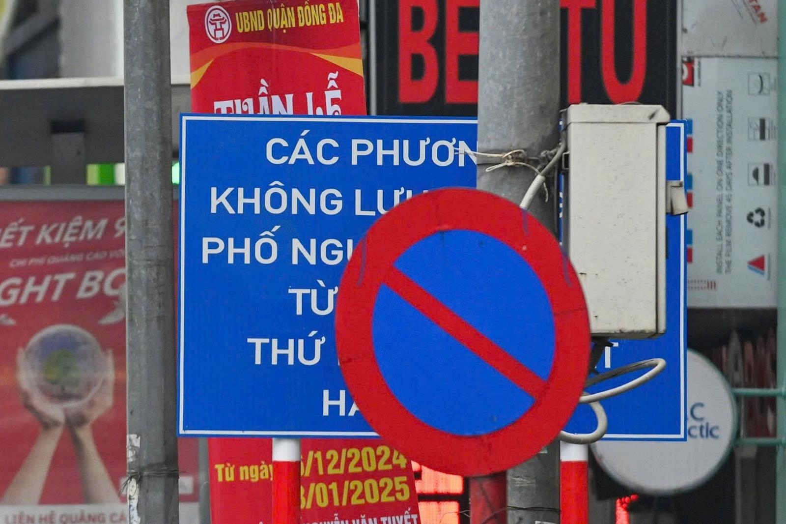 Một loạt biển báo giao thông bị chồng chéo, che khuất tại phố Tây Sơn, Hà Nội. Ảnh: QT