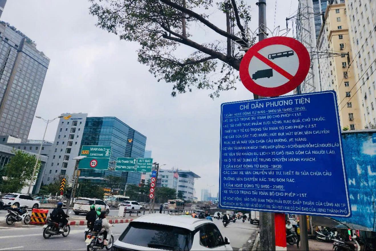 Đơn cử biển chỉ dẫn trên đường Phạm Hùng, quận Nam Từ Liêm quy định thời gian cấm hoạt động từ 6 - 9h và 16 - 19h30 đối với các xe: Xe tải có trọng tải toàn bộ cho phép ≤ 1,5T; xe tải chở thực phẩm tươi sống, rau quả, chở thuốc, thiết bị y tế có trọng tải toàn bộ cho phép ≤ 2,5T; xe cắt sửa cây, tưới nước, hút bụi, hút bùn, vận chuyển bùn, xe và máy sửa chữa cầu đường, xe nâng; xe vận tải hành khách theo hợp đồng > 9 chỗ (bao gồm cả người lái)... khiến người tham gia giao thông không đọc hết được.