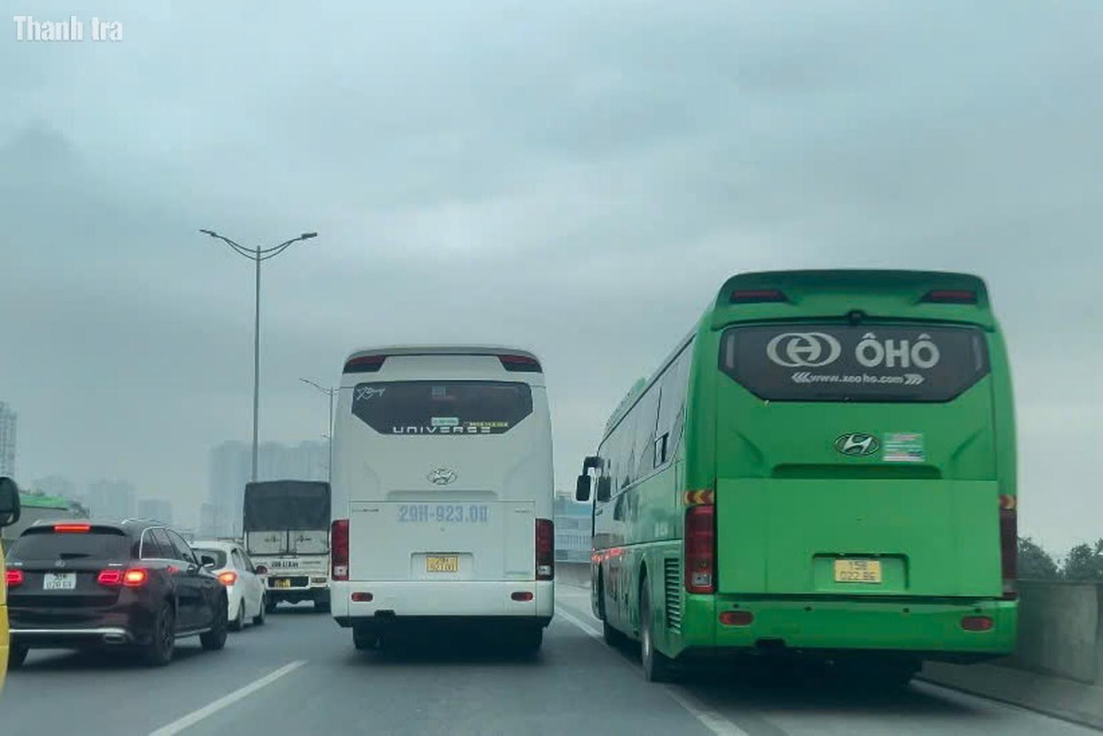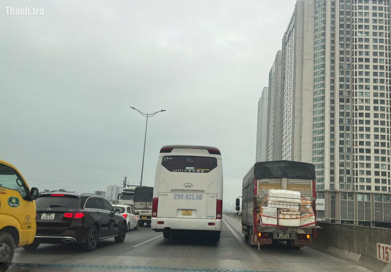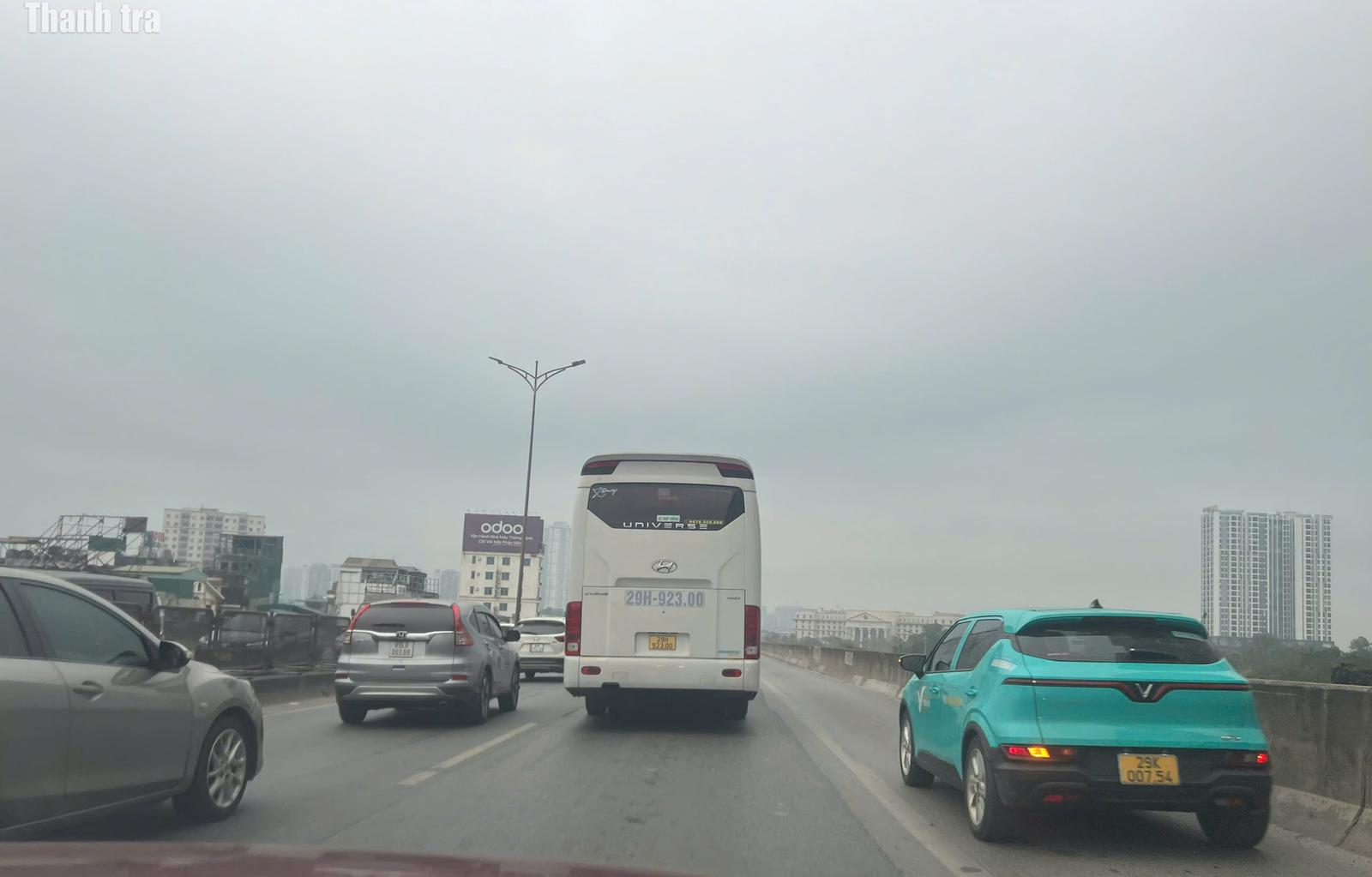 Xe khách biển kiểm soát 35E-00866 đi vào làn dừng khẩn cấp trên đường Vành đai 3 Hà Nội đoạn Tam Trinh - Linh Đàm. Ảnh chụp lúc 11h30 ngày 8/2/2026. Ảnh: Trần Quý