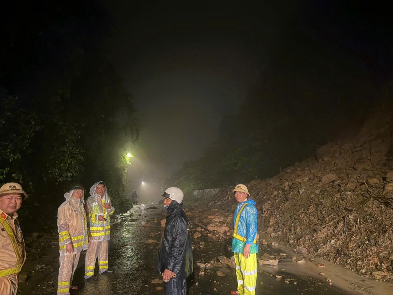 Cảnh sát giao thông và lực lượng chức năng túc trực tại khu vực sạt lở trong đêm, kiểm tra hiện trường và hướng dẫn người dân tránh xa điểm nguy hiểm. Ảnh: CA