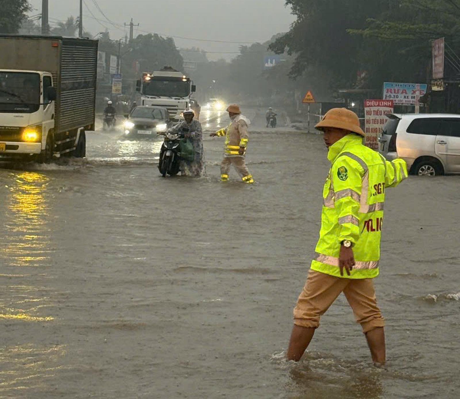 Lực lượng CSGT Đắk Lắk lội nước điều tiết giao thông trên tuyến đường bị ngập sâu, hướng dẫn phương tiện di chuyển an toàn trong mưa lớn. Ảnh: CA
