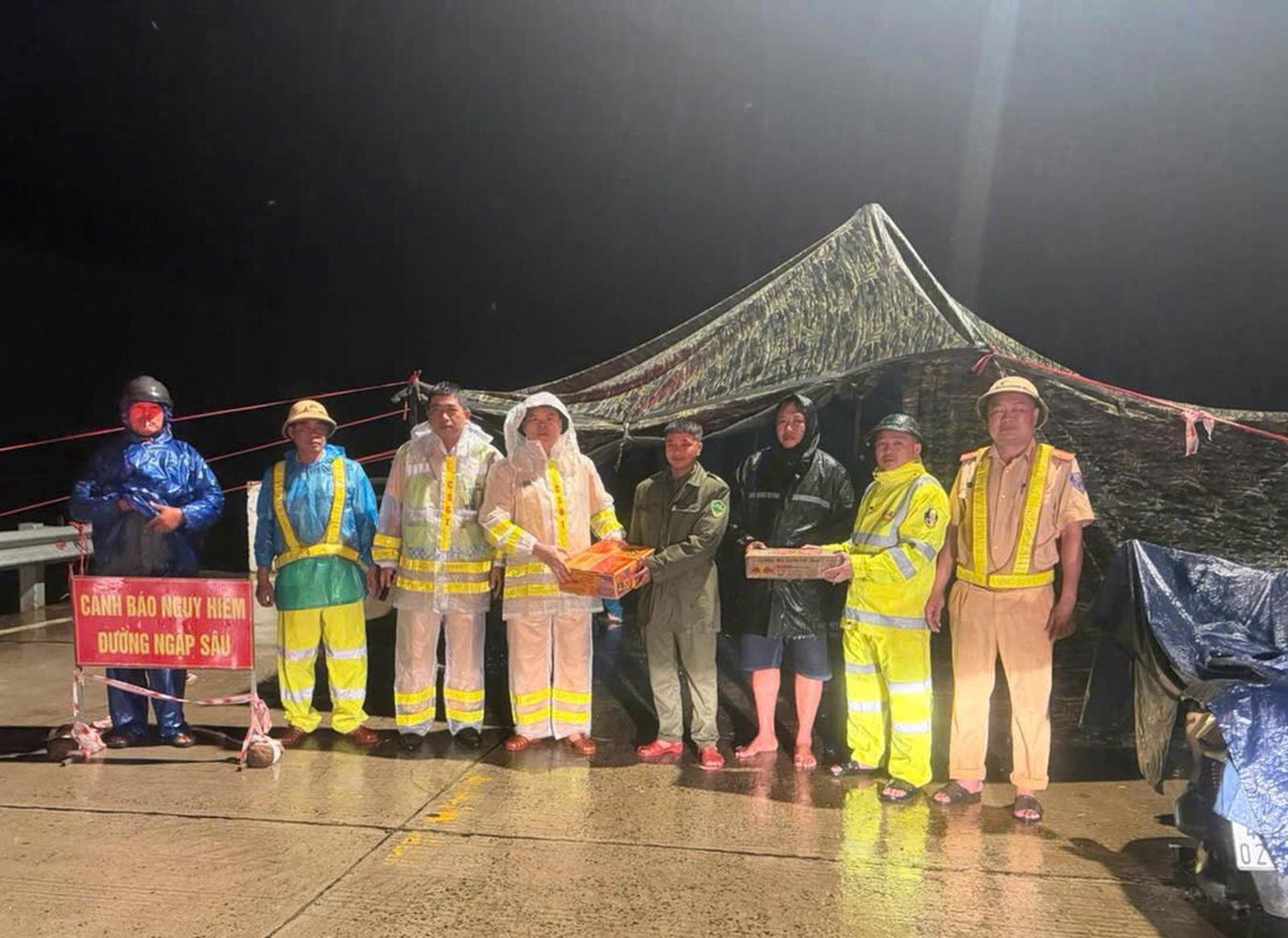 Dưới trời mưa không ngớt, họ vẫn kiên trì đứng chốt, dùng loa cảnh báo, hướng dẫn phương tiện di chuyển an toàn, nhắc nhở người dân hạn chế vào các vùng nguy hiểm.