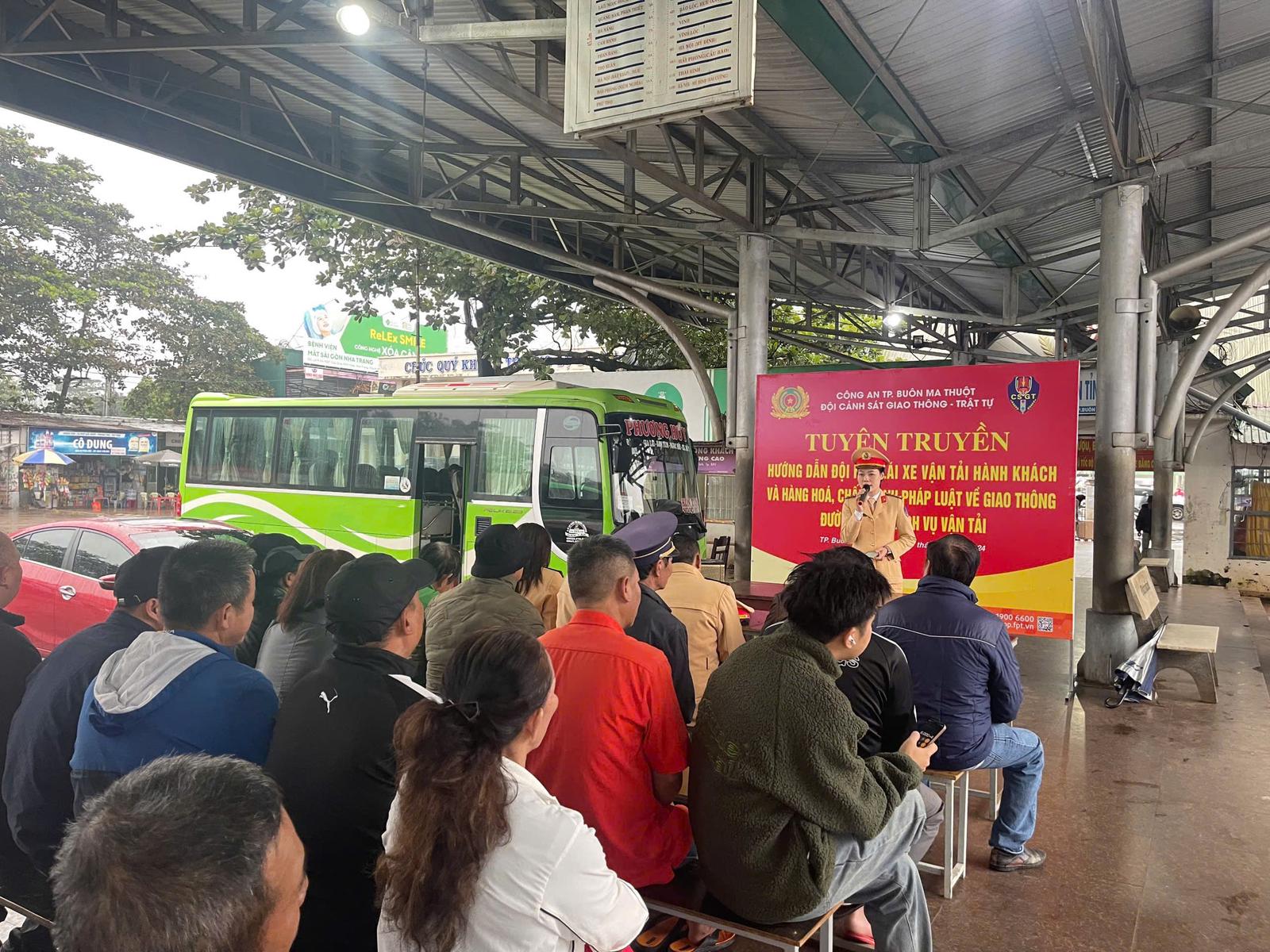 Lực lượng CSGT tổ chức tuyên truyền pháp luật về giao thông tại bến xe tỉnh Đắk Lắk. Ảnh: HH
