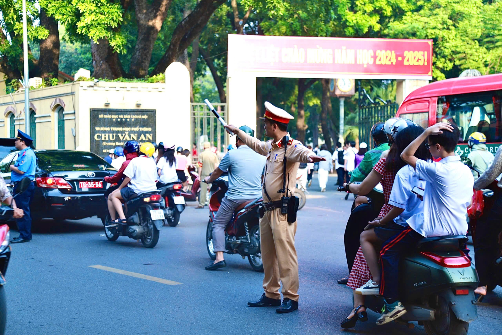 Đội CSGT đường bộ số 2 điều tiết giao thông tại cổng Trường THPT Chu Văn An. Ảnh: PV