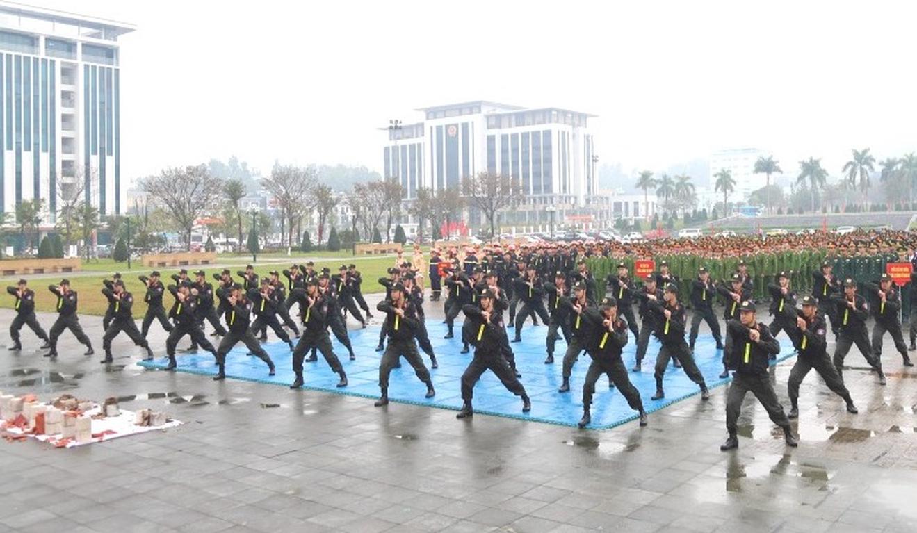 Tại buổi lễ, diễn ra màn biểu diễn võ thuật nghiệp vụ của Phòng Cảnh sát cơ động - Công an tỉnh với sự tham gia của 70 cán bộ, chiến sĩ gồm các bài công phá, kỹ thuật cường công, bài quyền, phân thế quyền và đặc biệt là xử lý các tình huống giả định phức tạp.