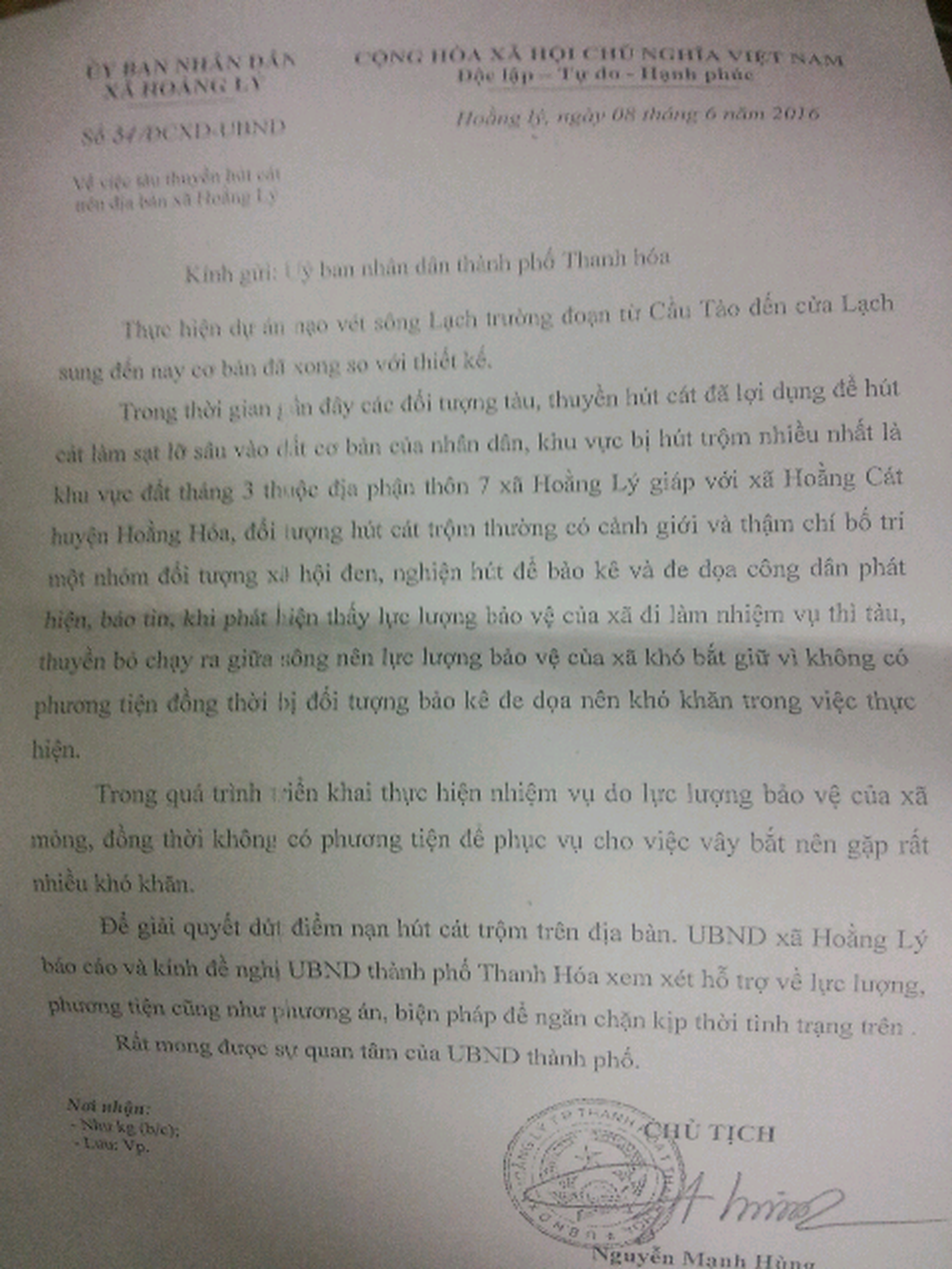 Với sự việc nêu trên, đề nghị UBND tỉnh Thanh Hóa sớm chỉ đạo các ban, ngành chức năng kiểm tra, xử lý nghiêm nạn cát tặc, mang lại trật tự trên lòng sông, tránh bức xúc dư luận xã hội.