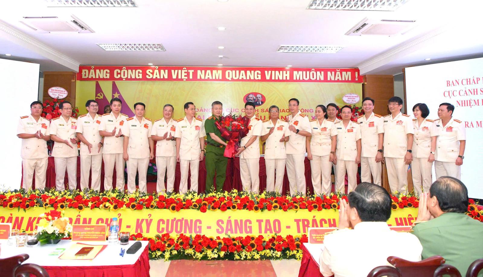 Thứ trưởng Nguyễn Ngọc Lâm tặng hoa chúc mừng Đảng bộ Cục Cảnh sát giao thông. Ảnh: BCA