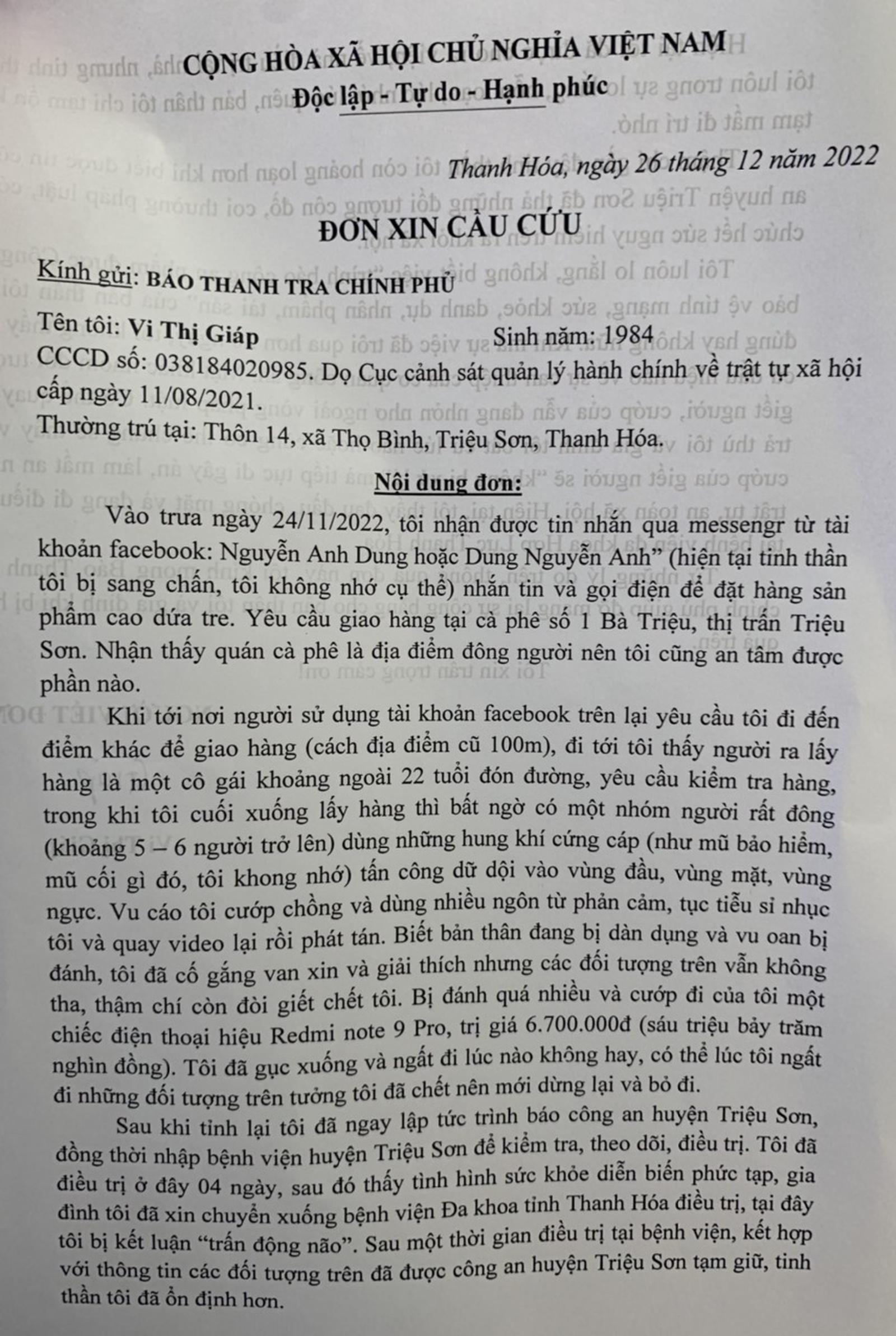 Khi tỉnh lại, chị Giáp đã đến công an trình báo và nhập viện để kiểm tra, điều trị sức khỏe ở Bệnh viện Đa khoa huyện Triệu Sơn và Bệnh viện Đa khoa tỉnh Thanh Hóa và bị kết luận “chấn động não”.