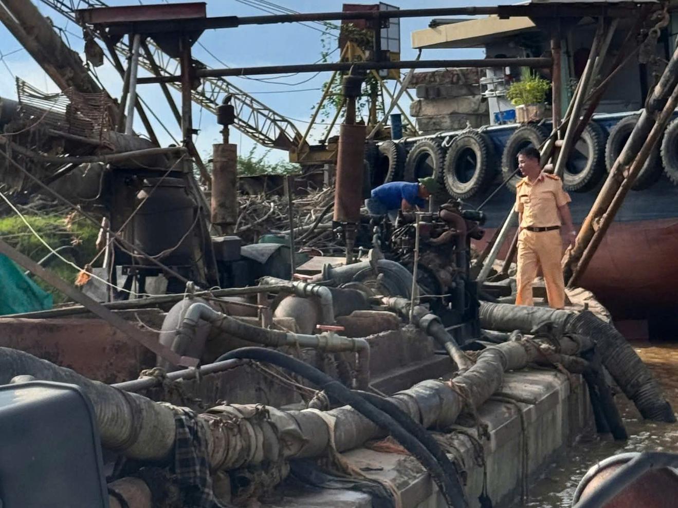 Qua kiểm tra, lực lượng chức năng phát hiện trên tàu chứa khoảng 27 m³ cát, cùng nhiều thiết bị chuyên dụng phục vụ hoạt động khai thác trái phép như: đầu máy nổ, hệ thống bơm hút cát, máng sàng lọc.