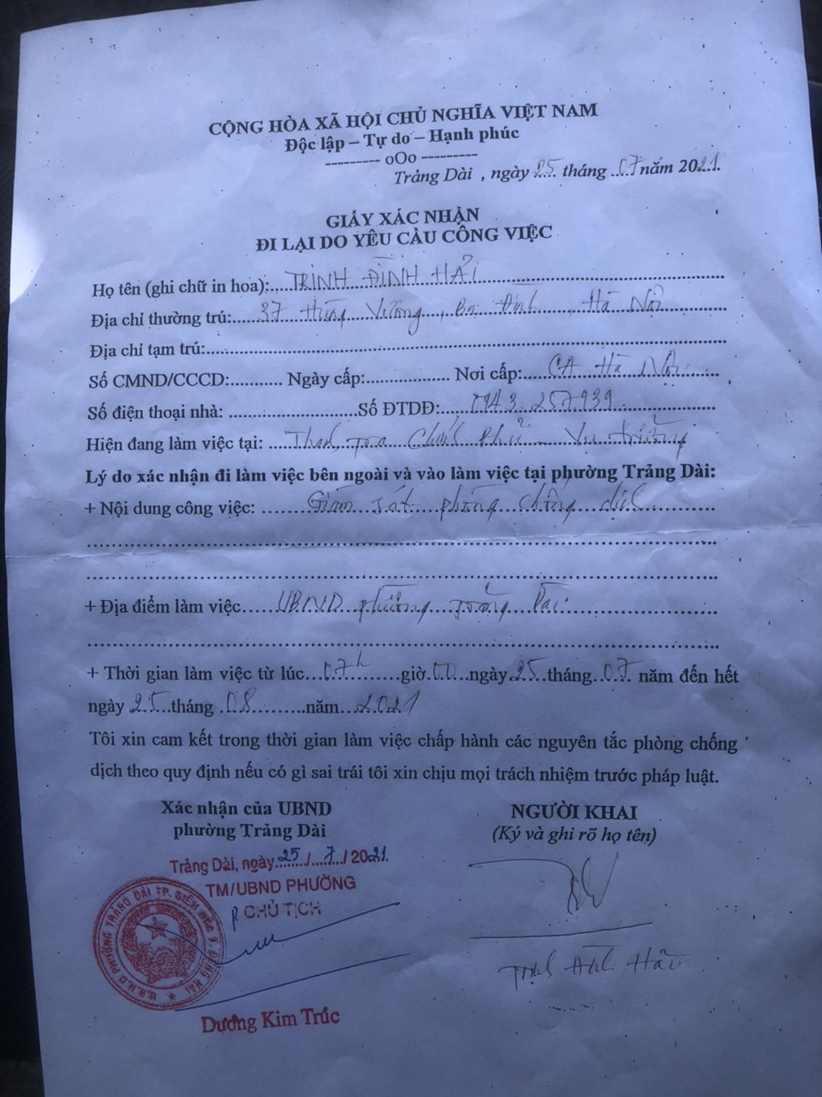 Sáng ngày 1/9, Chủ tịch UBND phường Trảng Dài xác nhận với PV Báo Thanh tra là có việc bà Dương Kim Trúc, Phó Chủ tịch UBND phường xác nhận trên "giấy đi đường" cho đối tượng Trịnh Đình Hải. Ảnh: CT