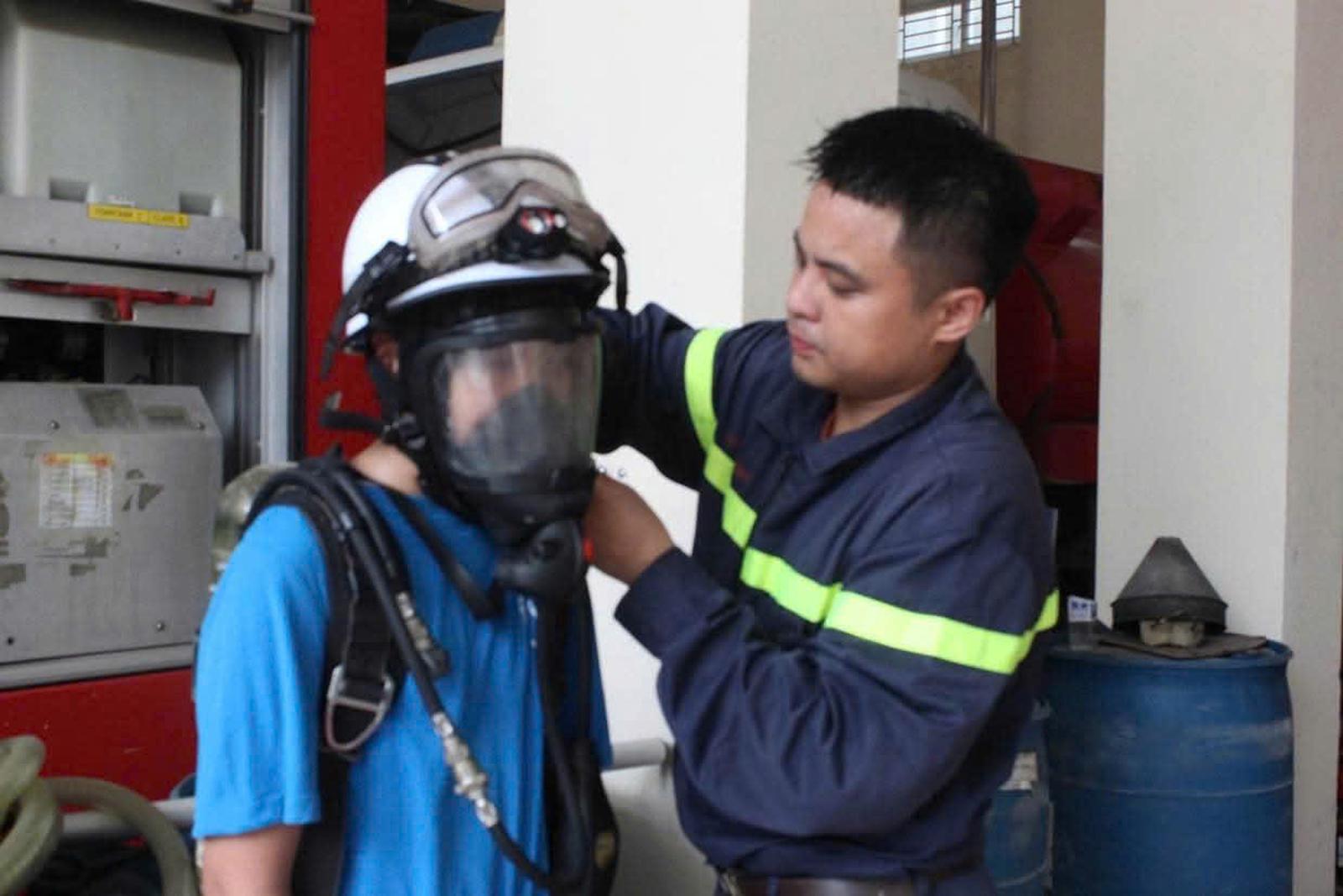 Hướng dẫn trẻ khiếm thính sử dụng mặt nạ phòng độc trong môi trường khói. Ảnh: CAHN