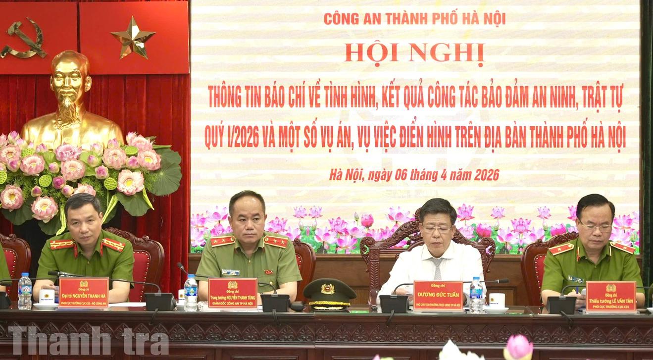 Chiều 6/4, Công an thành phố Hà Nội hội nghị thông tin báo chí về tình hình an ninh trật tự quý 1/2026. Ảnh: Trọng Tài