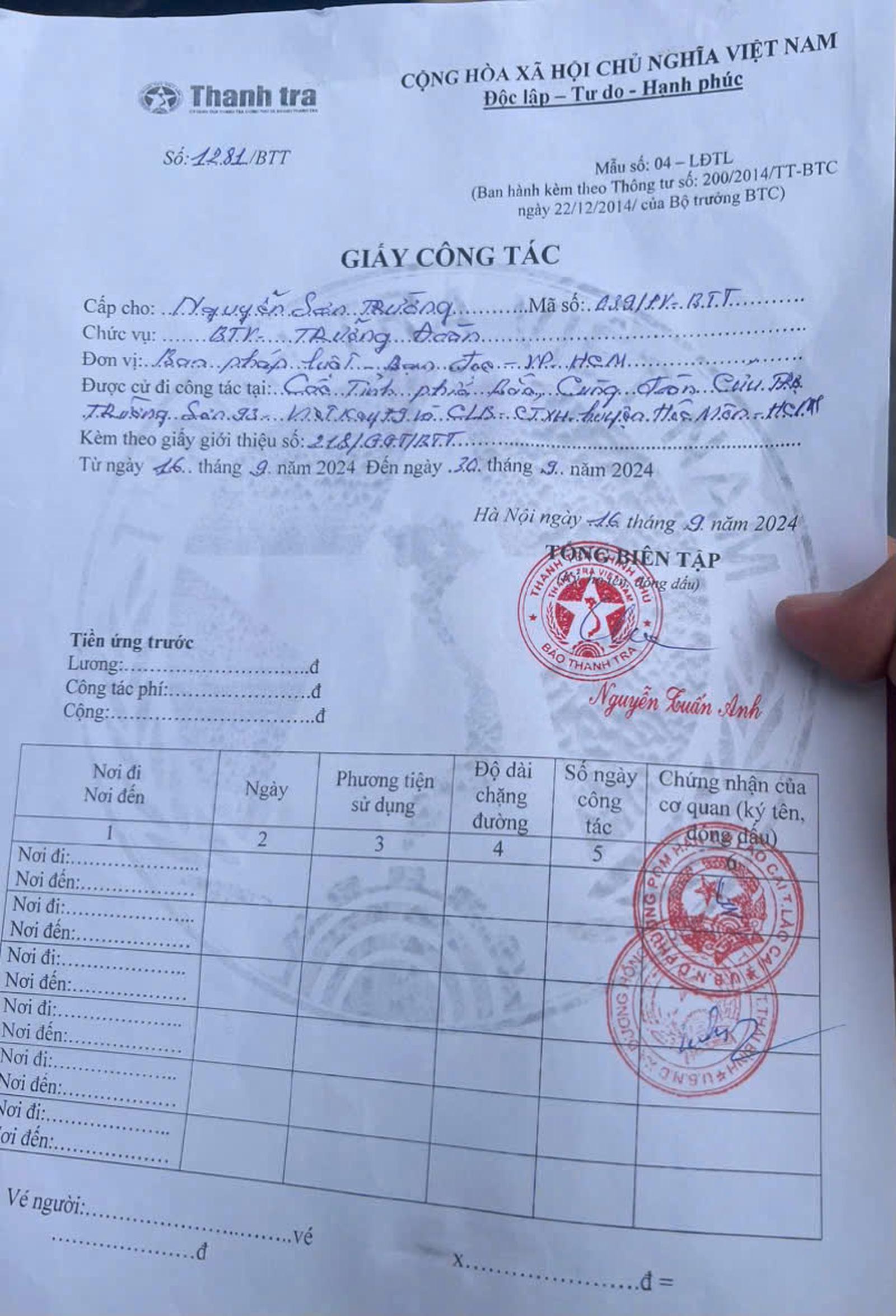 Giấy công tác giả của Nguyễn Sơn Trường xuất trình với Công an. Ảnh: LHC