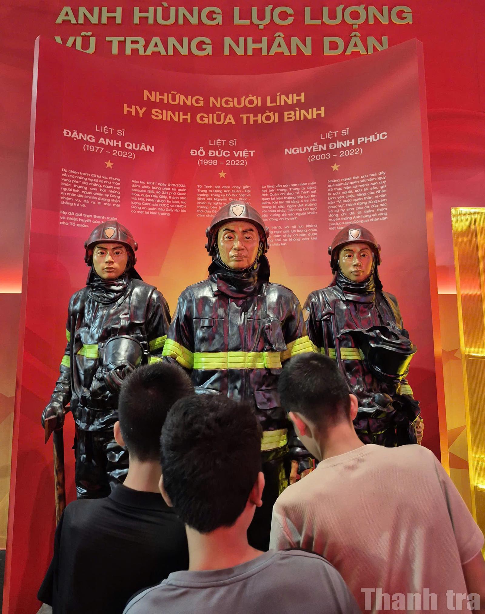 Tại gian trưng bày trong nhà, có cụm tượng 3 Liệt sĩ lực lượng Cảnh sát phòng cháy, chữa cháy, cứu nạn, cứu hộ. Ảnh: TM
