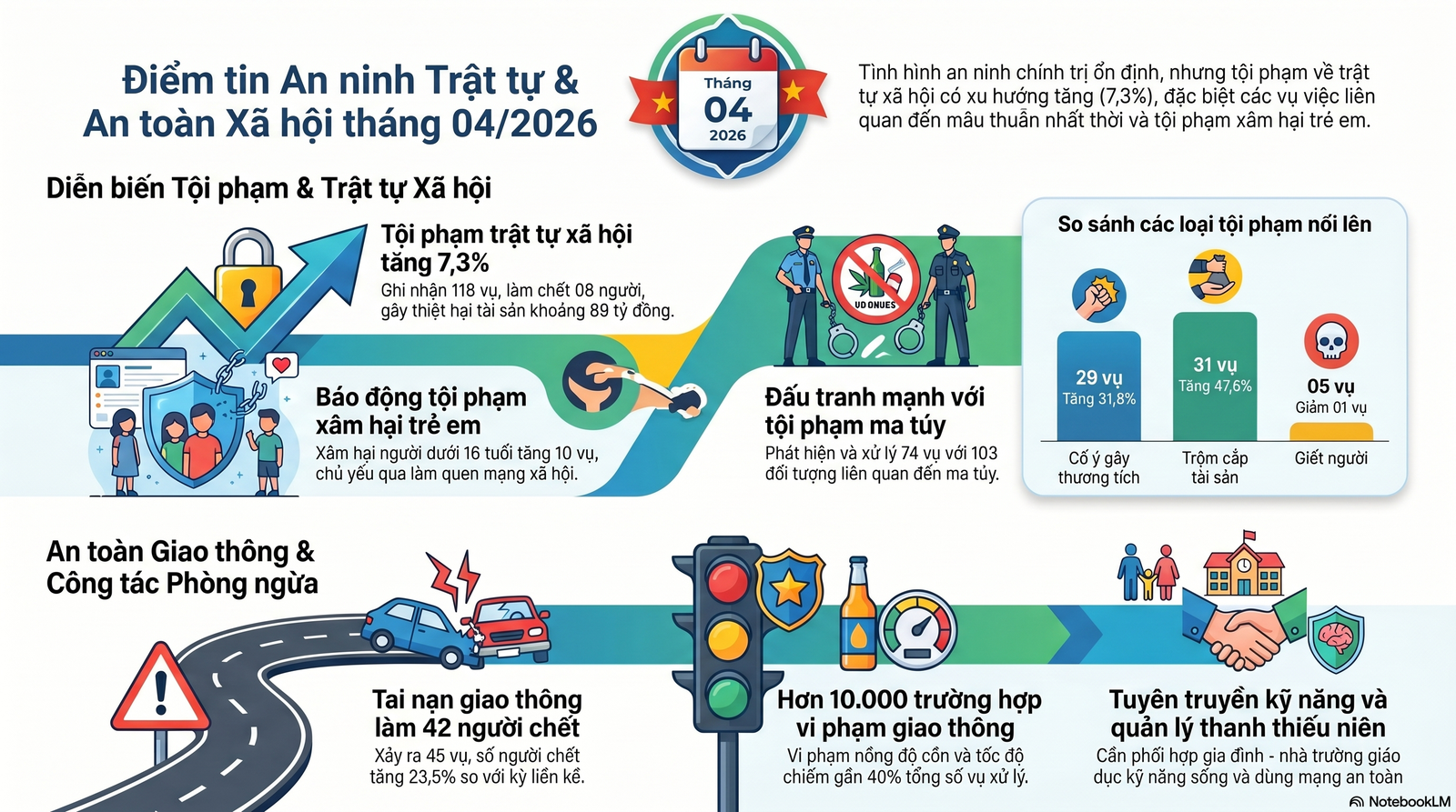 Một số loại tội phạm nổi lên trong tháng 4 bao gồm: Tội phạm giết người ghi nhận 5 vụ, giảm 1 vụ so với cùng kỳ, nguyên nhân chủ yếu do mâu thuẫn nhất thời trong sinh hoạt, giao thông hoặc ghen tuông. Tội phạm cố ý gây thương tích tăng mạnh 31,8% với 29 vụ, phần lớn do thanh thiếu niên thực hiện sau khi sử dụng rượu bia hoặc mâu thuẫn bộc phát. Tội phạm xâm hại tình dục người dưới 16 tuổi tăng cao với 15 vụ, chủ yếu thông qua việc làm quen qua mạng xã hội. Trộm cắp tài sản, ghi nhận 31 vụ, tăng 10 vụ so với kỳ liền kề do sự sơ hở của chủ sở hữu.
