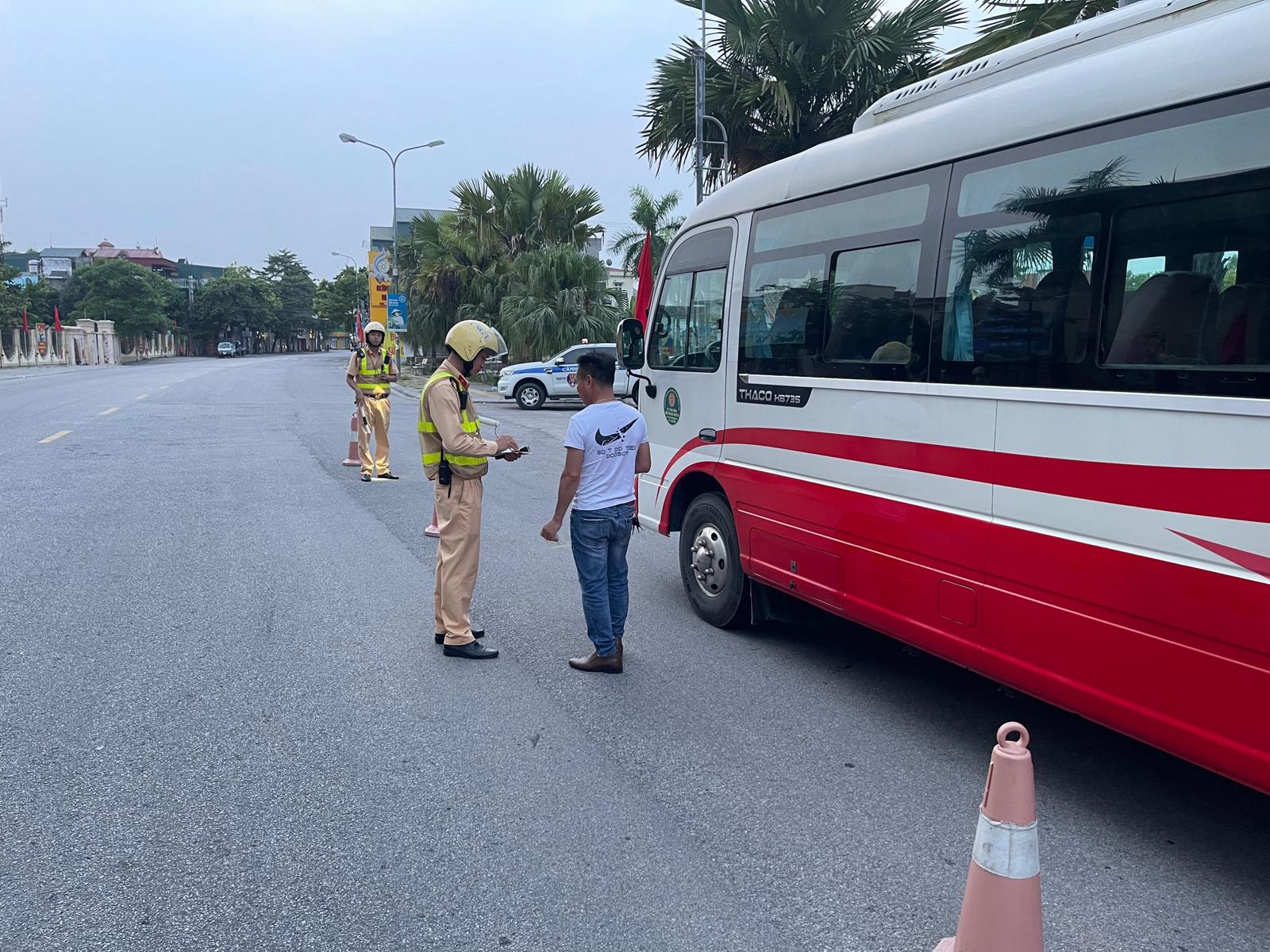 Đội Cảnh sát Giao thông, Công an huyện Thanh Hà dừng kiểm tra xe khách vi phạm trên tuyến đường tỉnh 390 thuộc địa phận huyện Thanh Hà, tỉnh Hải Dương. Ảnh: LC