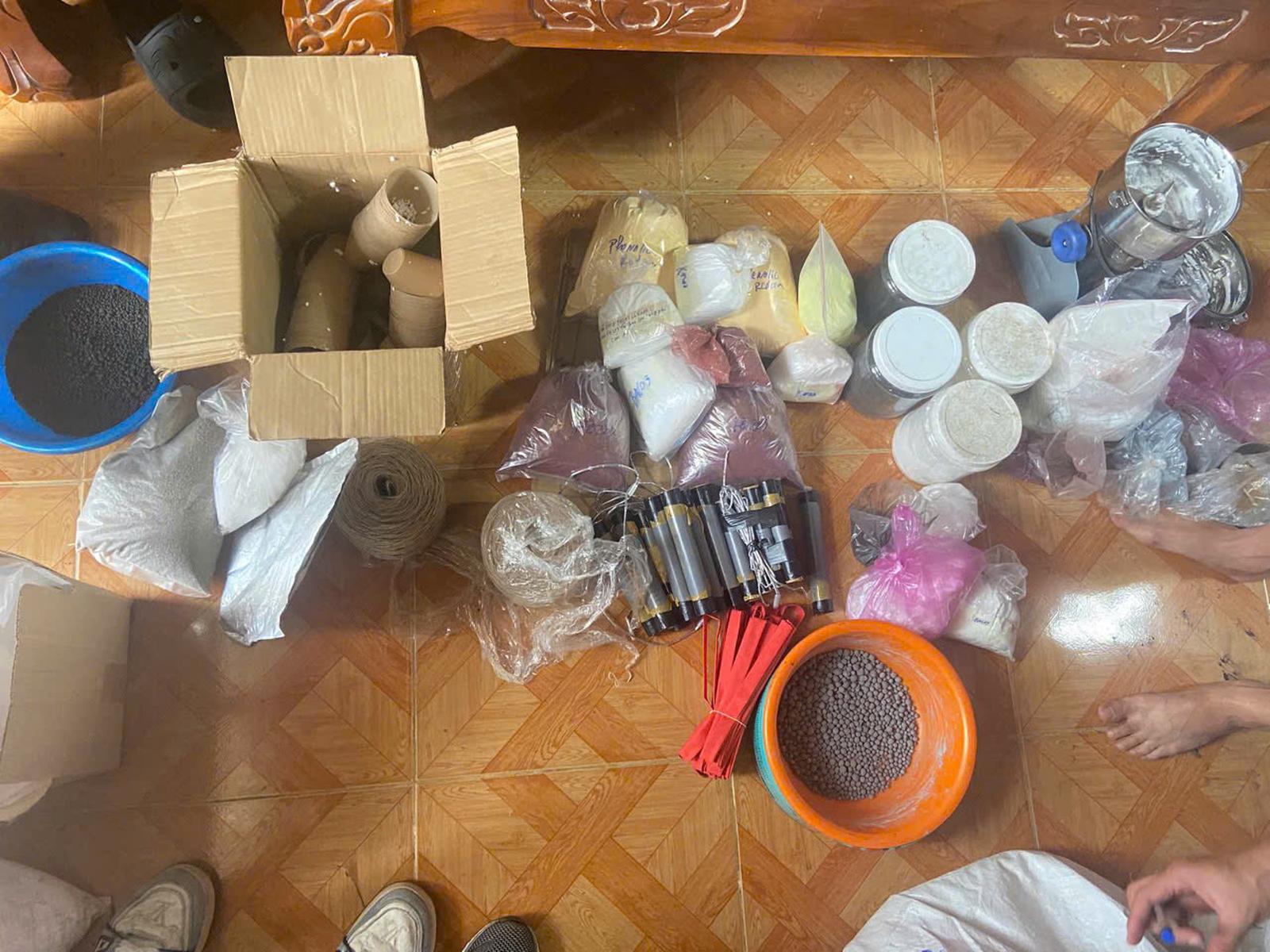 Ngoài ra, còn một số thành phẩm đã được B.V.L. pha trộn các loại hóa chất nhằm mục đích chế tạo pháo hoa, pháo trứng để chơi vào dịp Tết. Tổng trọng lượng tất cả các loại hóa chất thu được là 107,5kg. Bên cạnh đó, cơ quan chức năng còn phát hiện nhiều ống thuốc đã trộn sẵn kèm theo dây cháy chậm, hàng ngàn vỏ cầu giấy, ly giấy chuyên để chế tạo pháo nổ dạng pháo trứng và nhiều thiết bị dùng để phục vụ việc chia nhỏ, pha trộn hóa chất như: Cân tiểu ly, máy xay, máy trộn…