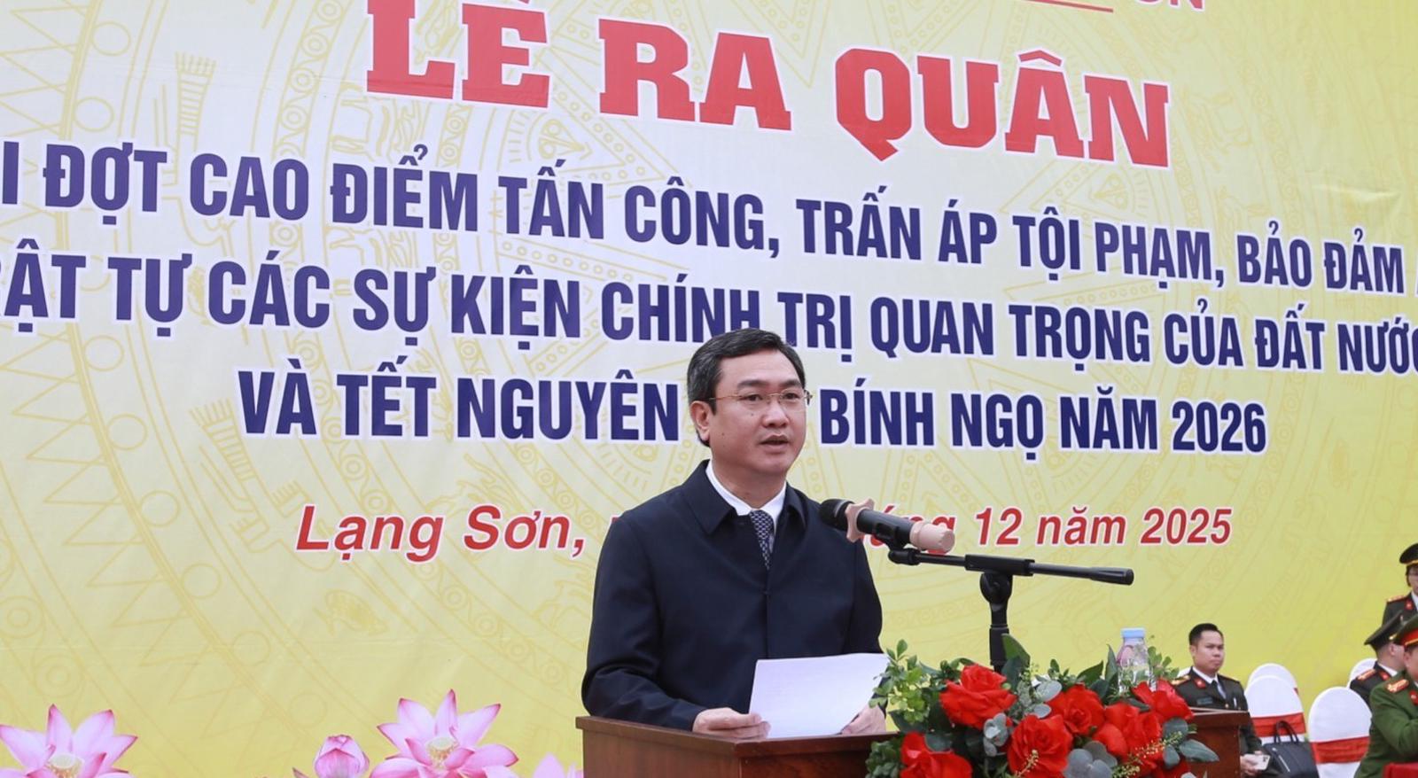 Tại lễ ra quân, Chủ tịch UBND tỉnh Lạng Sơn Nguyễn Cảnh Toàn đề nghị lực lượng công an toàn tỉnh chủ động nắm chắc tình hình, tham mưu giải pháp bảo đảm ANTT phục vụ phát triển kinh tế - xã hội và đối ngoại; phối hợp chặt chẽ với các đơn vị liên quan trong bảo vệ chính trị nội bộ, bảo vệ bí mật Nhà nước, bảo đảm an ninh mạng; triển khai đồng bộ biện pháp phòng ngừa, đấu tranh với tội phạm và vi phạm pháp luật.