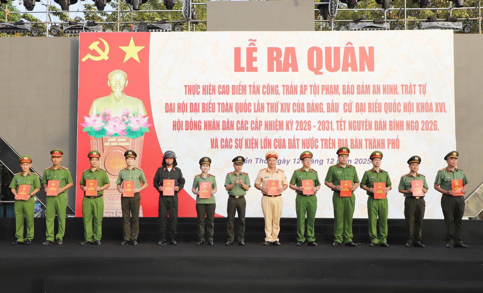 (Thanh tra) - Ngày 12/12, Công an TP Cần Thơ tổ chức lễ ra quân thực hiện đợt cao điểm tấn công, trấn áp tội phạm nhằm bảo đảm an ninh, trật tự phục vụ Đại hội đại biểu toàn quốc lần thứ XIV của Đảng; bầu cử đại biểu Quốc hội khóa XVI và HĐND các cấp nhiệm kỳ 2026-2031; Tết Nguyên đán Bính Ngọ 2026 cùng nhiều sự kiện quan trọng khác diễn ra trên địa bàn thành phố.
