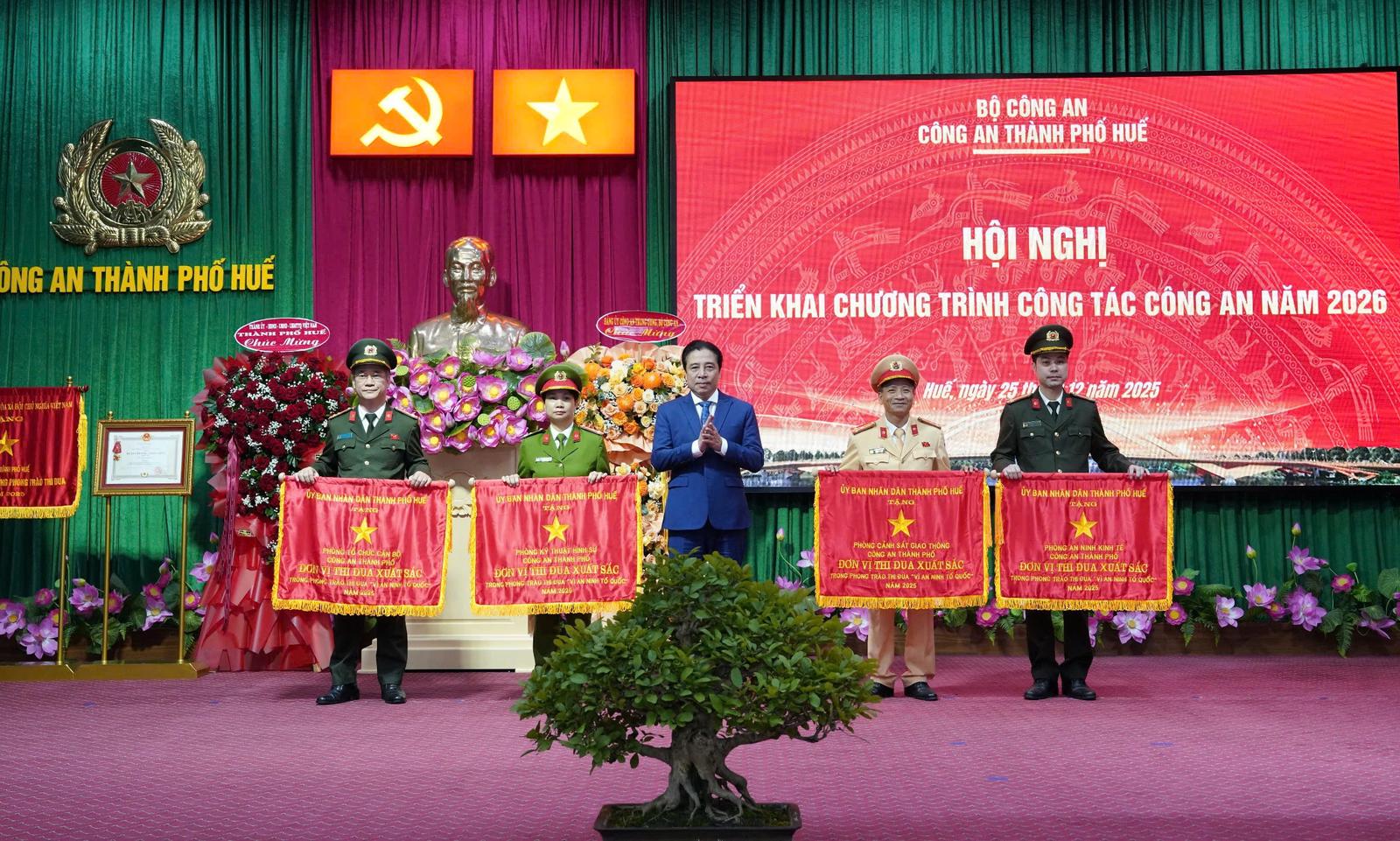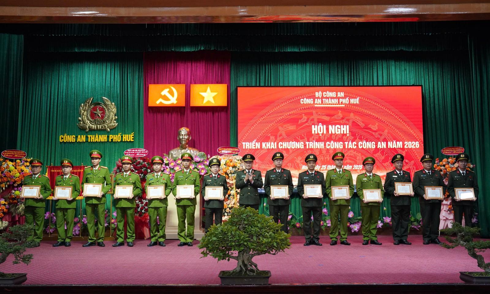 Thừa ủy quyền của Thủ tướng Chính phủ, tại hội nghị, Thứ trưởng Lê Quốc Hùng đã trao Bằng khen của Thủ tướng Chính phủ cho 1 tập thể và 1 cá nhân; trao cờ của Bộ Công an cho 8 đơn vị xuất sắc dẫn đầu phong trào thi đua Vì an ninh Tổ quốc. Chủ tịch UBND TP Huế Nguyễn Khắc Toàn đã trao Cờ thi đua cho 4 đơn vị xuất sắc trong phong trào thi đua Vì an ninh Tổ quốc; Thiếu tướng Nguyễn Thanh Tuấn, Giám đốc Công an TP Huế trao tặng danh hiệu đơn vị quyết thắng cho 28 tập thể và giấy khen cho 5 tổ chức Đảng hoàn thành xuất sắc nhiệm vụ năm 2025, 4 đảng viên hoàn thành xuất sắc nhiệm vụ 5 năm liền (2021-2025).