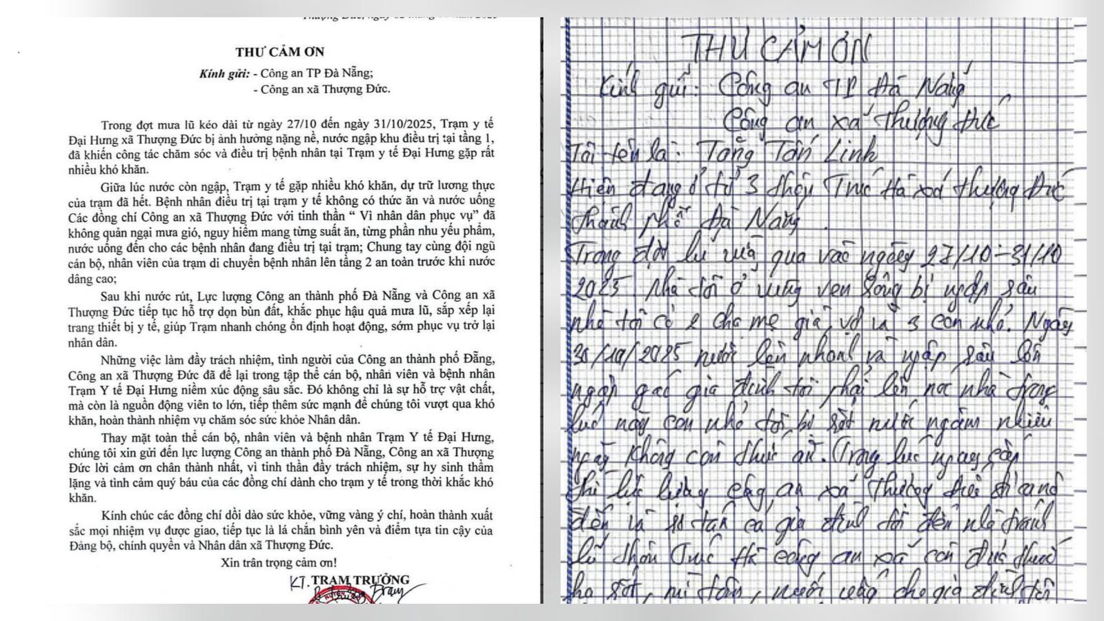Công an TP Đà Nẵng cho biết, mới đây, Trạm Y tế Đại Hưng cùng một người dân trên địa bàn là ông Tăng Tấn Linh đã gửi thư cảm ơn, bày tỏ lòng biết ơn trước sự dũng cảm, tận tụy của các cán bộ, chiến sĩ Công an xã Thượng Đức.
