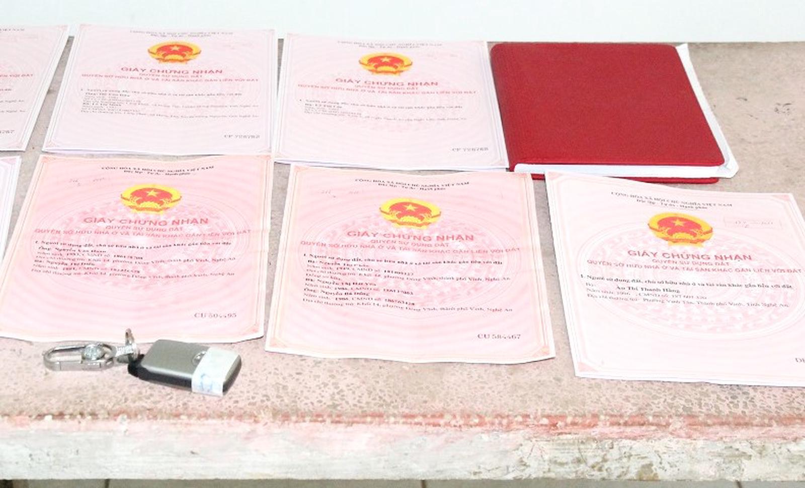 Giấy chứng nhận quyền sử dụng đất giả và các vật chứng liên quan chuyên án. Ảnh: NH