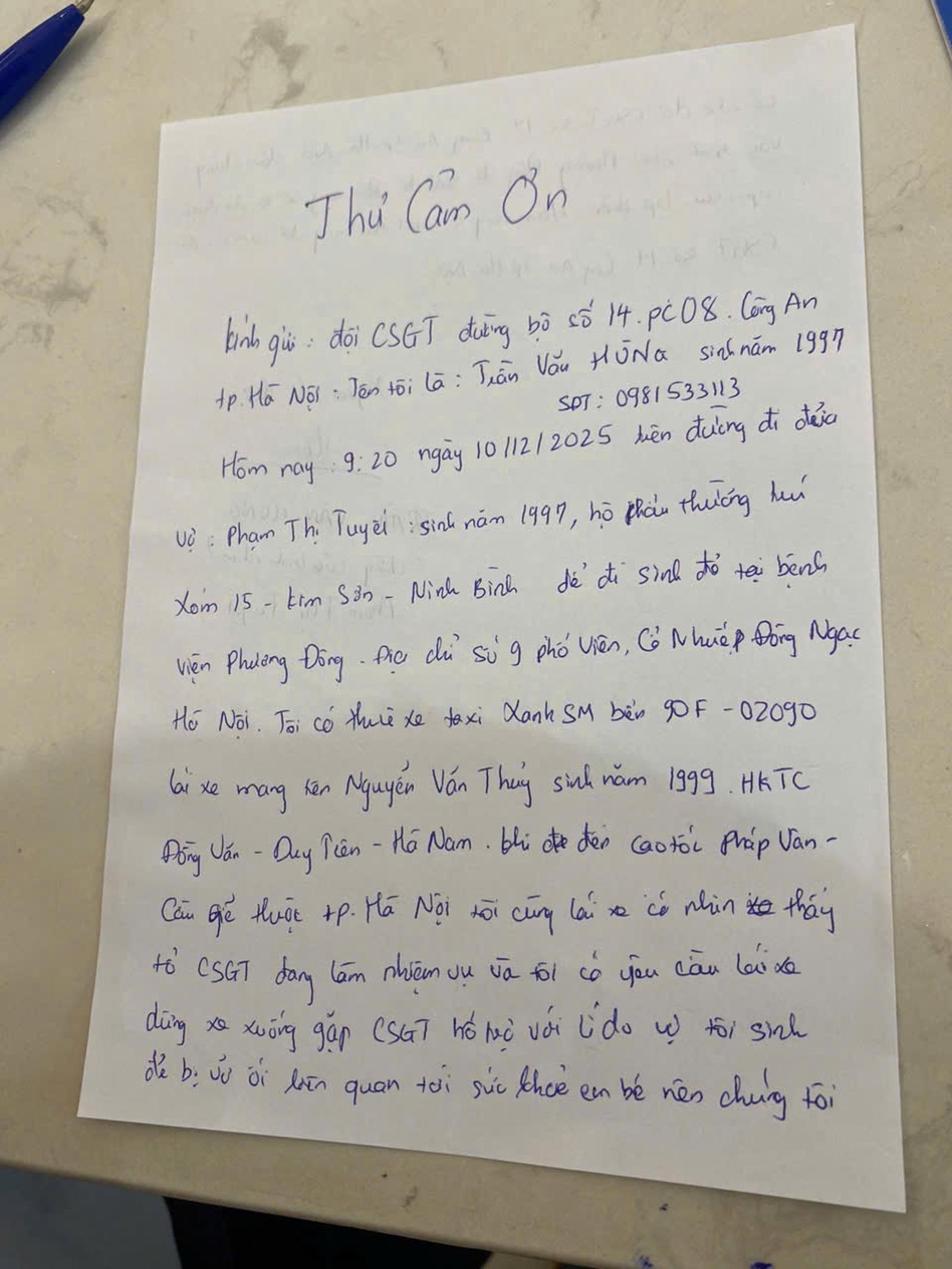 Nhờ sự hỗ trợ kịp thời của lực lượng CSGT, sản phụ được các y bác sĩ tiếp nhận cấp cứu ngay và sinh con an toàn, mẹ tròn con vuông. Sau khi vợ được đưa đến bệnh viện an toàn, anh Trần Văn H. đã liên hệ, gửi thư cảm ơn tổ công tác vì sự hỗ trợ tận tình.
