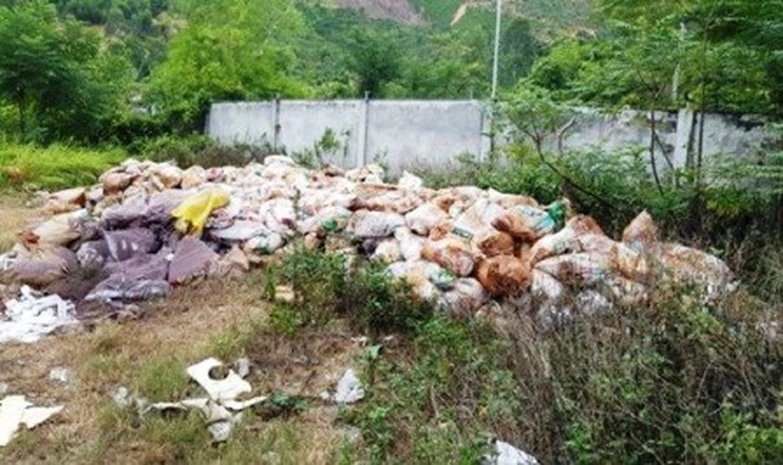 Một lượng chất thải chứa trong bao còn để trên mặt đất. Ảnh: Ngọc Phó