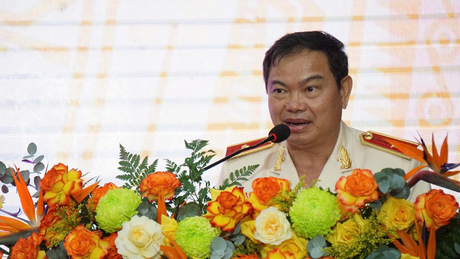 Thiếu tướng Phan Thanh Tám, Ủy viên Ban Thường vụ Tỉnh ủy, Bí thư Đảng ủy, Giám đốc Công an tỉnh Đắk Lắk phát biểu tại Đại hội. Ảnh: CA