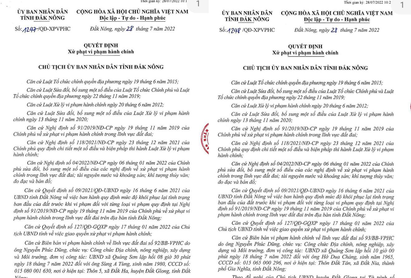 Các quyết định xử phạt của UBND tỉnh Đắk Nông. Ảnh: Trần Thọ