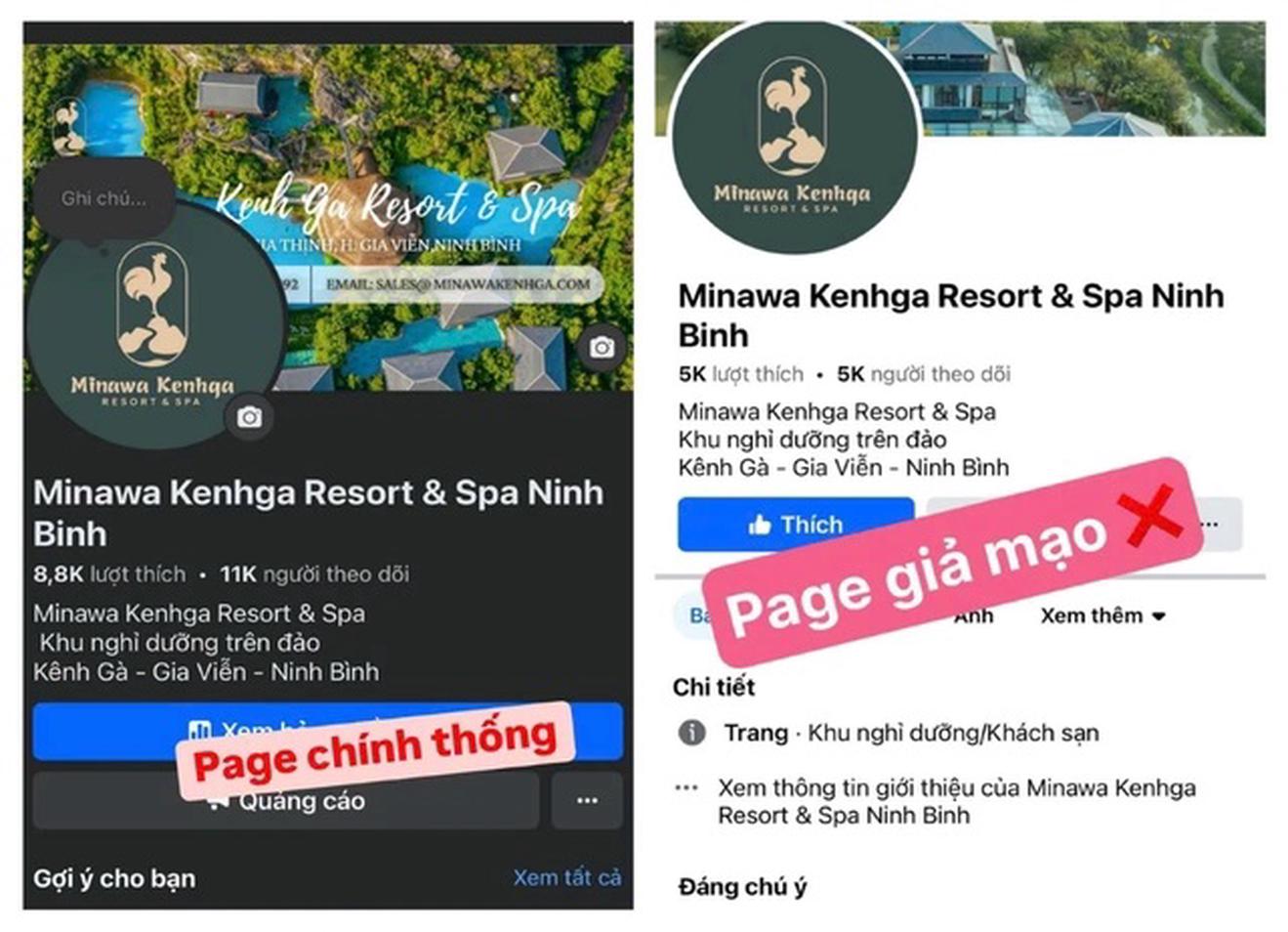 Fanpage Facebook chính thống và giả mạo của Khu nghỉ dưỡng Minawa Kênh Gà. Ảnh: Công an Ninh Bình
