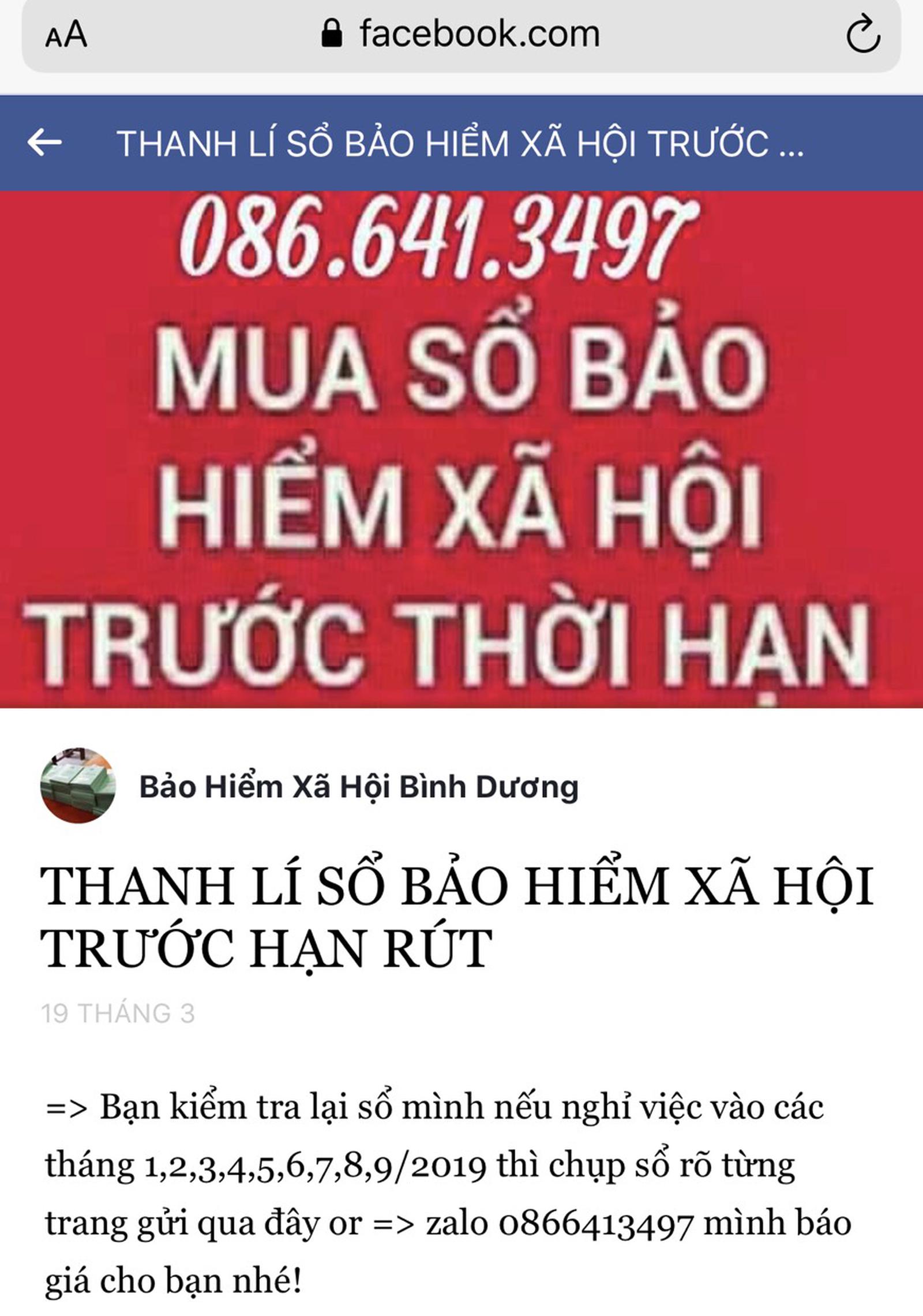 Các đối tượng đã lập trang Facebook mạo danh BHXH tỉnh Bình Dương để rao mua sổ BHXH. Ảnh: đơn vị cung cấp