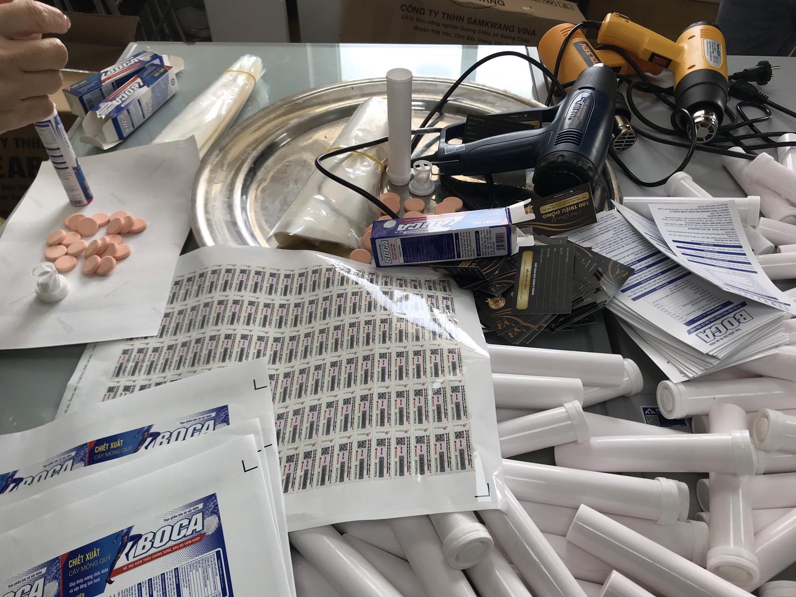 Lực lượng chức năng đã thu giữ tang vật gồm: 700 hộp sản phẩm thực phẩm bảo vệ sức khỏe giả nhãn hiệu Boca; 1.000 mẫu tem giả nhãn hiệu Boca; 4 điện thoại di động; 100 giấy hướng dẫn sử dụng sản phẩm thực phẩm chức năng Boca; 3 máy khò; 100 cuộn nilong khổ lớn dùng để bọc sản phẩm và nhiều dụng cụ khác để phục vụ việc sản xuất hàng giả.