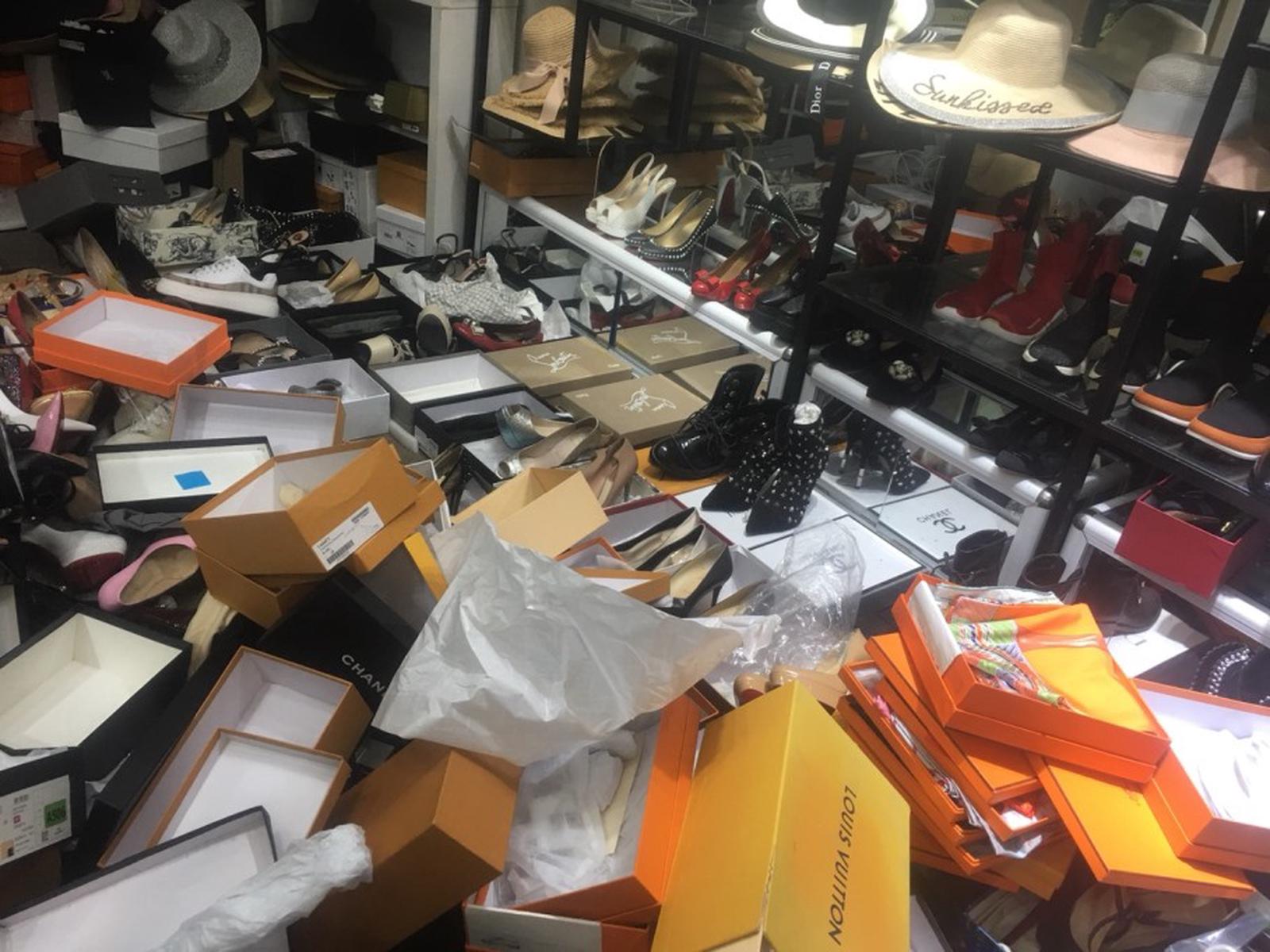Trong đó có 1.626 sản phẩm túi xách, ví da, phụ kiện thời trang, thắt lưng, quần, mũ, dép, áo sơ mi, giầy, xăng đan có dấu hiệu giả mạo các nhãn hiệu Burrbery, Lacost, Fendi, Nike, Adidas, Gucci, Chanel, LV, Hermes, Dior, Valentino, Ferragamo, LV, Salvatore Ferragamo, Goyard, Louboutin, Lascote, Versace, Polo, Calvin Klein, Montblanc và 748 sản phẩm quần áo, mỹ ký, dây lưng không có hóa đơn, chứng từ.