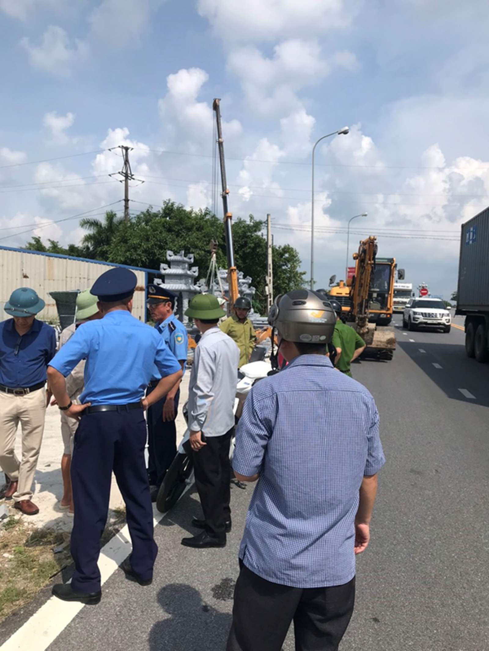 Lực lượng chức năng giải tỏa hành lang an toàn đường bộ trên Quốc lộ 10. Ảnh: CB
