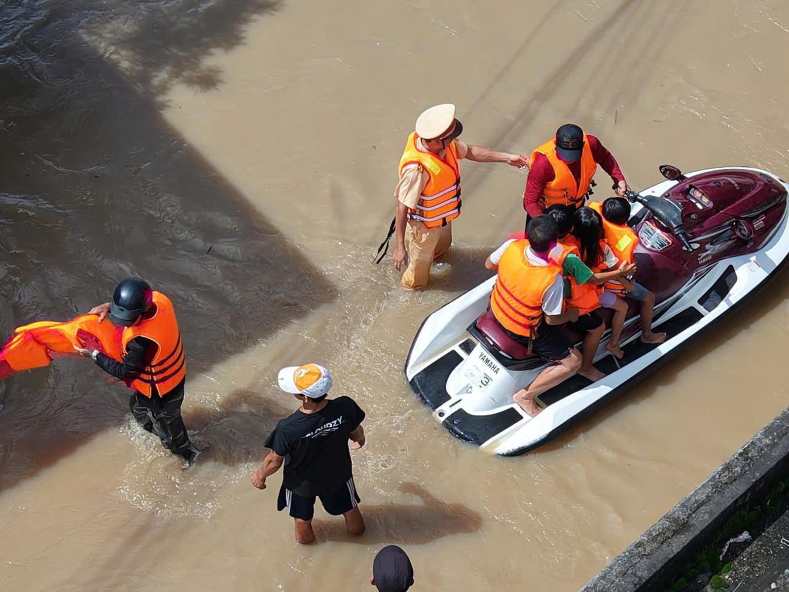 Phòng Cảnh sát Giao thông công an tỉnh Lâm Đồng hỗ trợ người dân trong đợt mưa lũ vừa qua. Ảnh: CTV