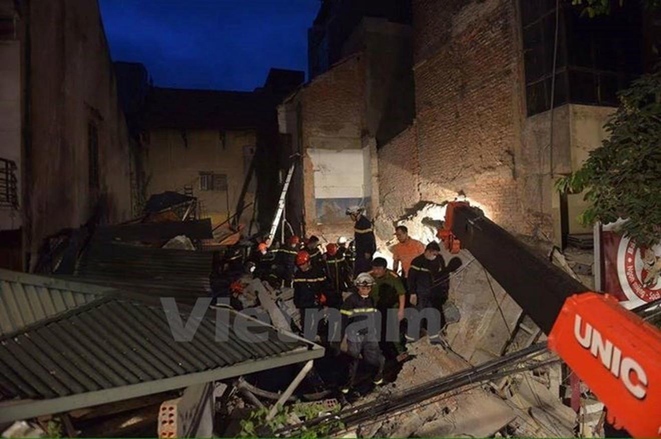 Lực lượng chức năng đang cứu hộ nạn nhân trong ngôi nhà 4 tầng tại 43 Cửa Bắc, Hà Nội. (Ảnh: Lê Minh Sơn/Vietnam+)