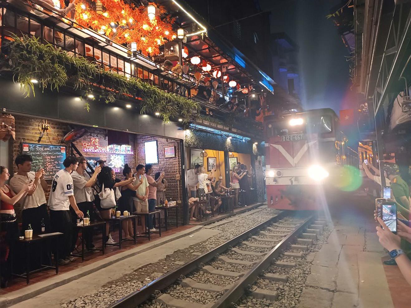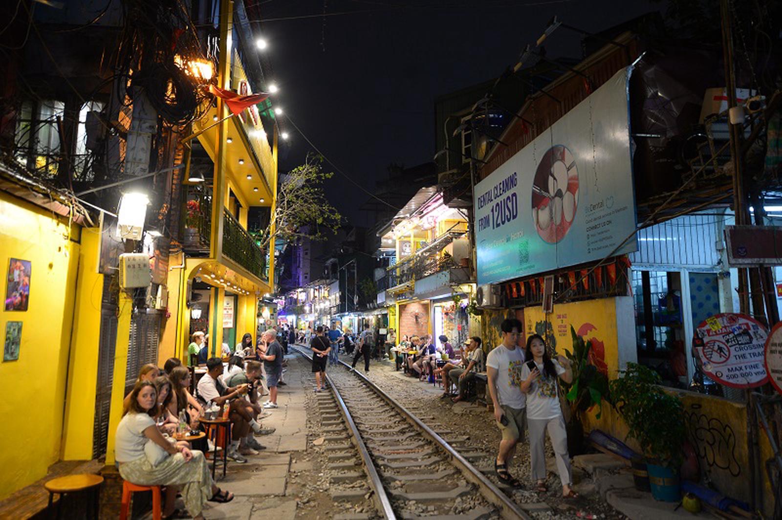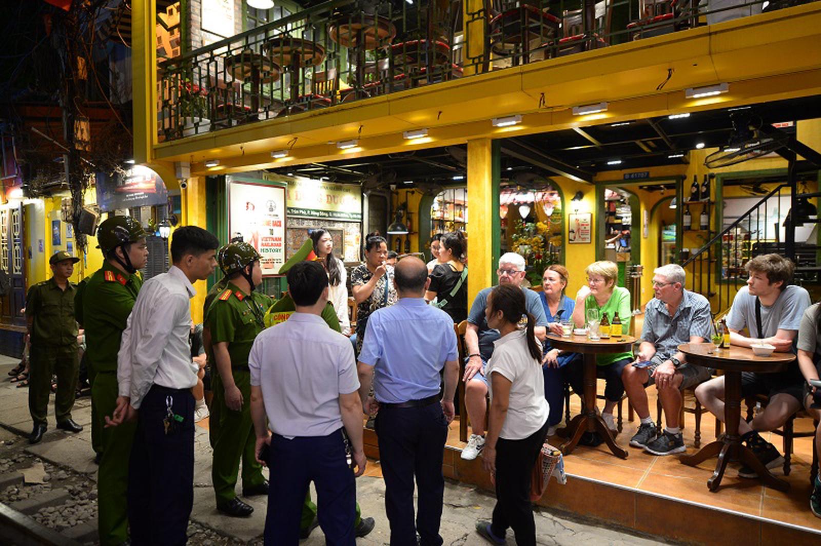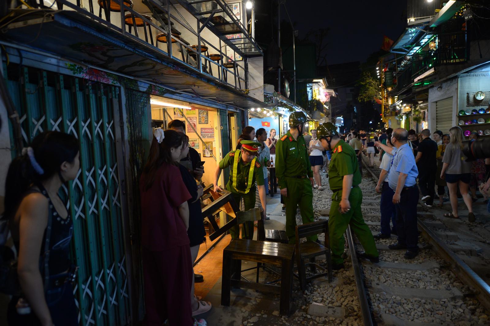 Chỉ ít phút trước khi lực lượng chức năng xuất hiện, khu cà phê đường tàu trên địa bàn phường Hoàn Kiếm, Hà Nội, vẫn đông khách. Nhiều quán bày bàn ghế tràn ra sát đường ray, nhân viên liên tục mời chào du khách.