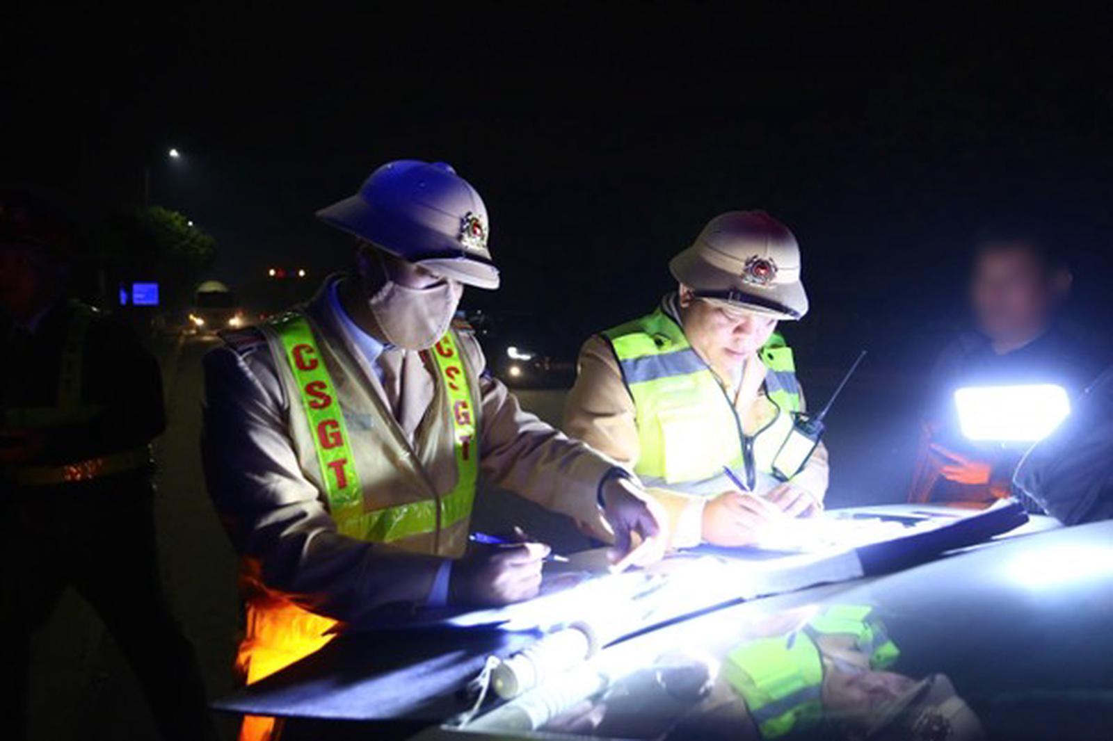 CSGT lập biên bản xử lý tài xế chở hàng quá tải, tối 9/12. Ảnh: NT