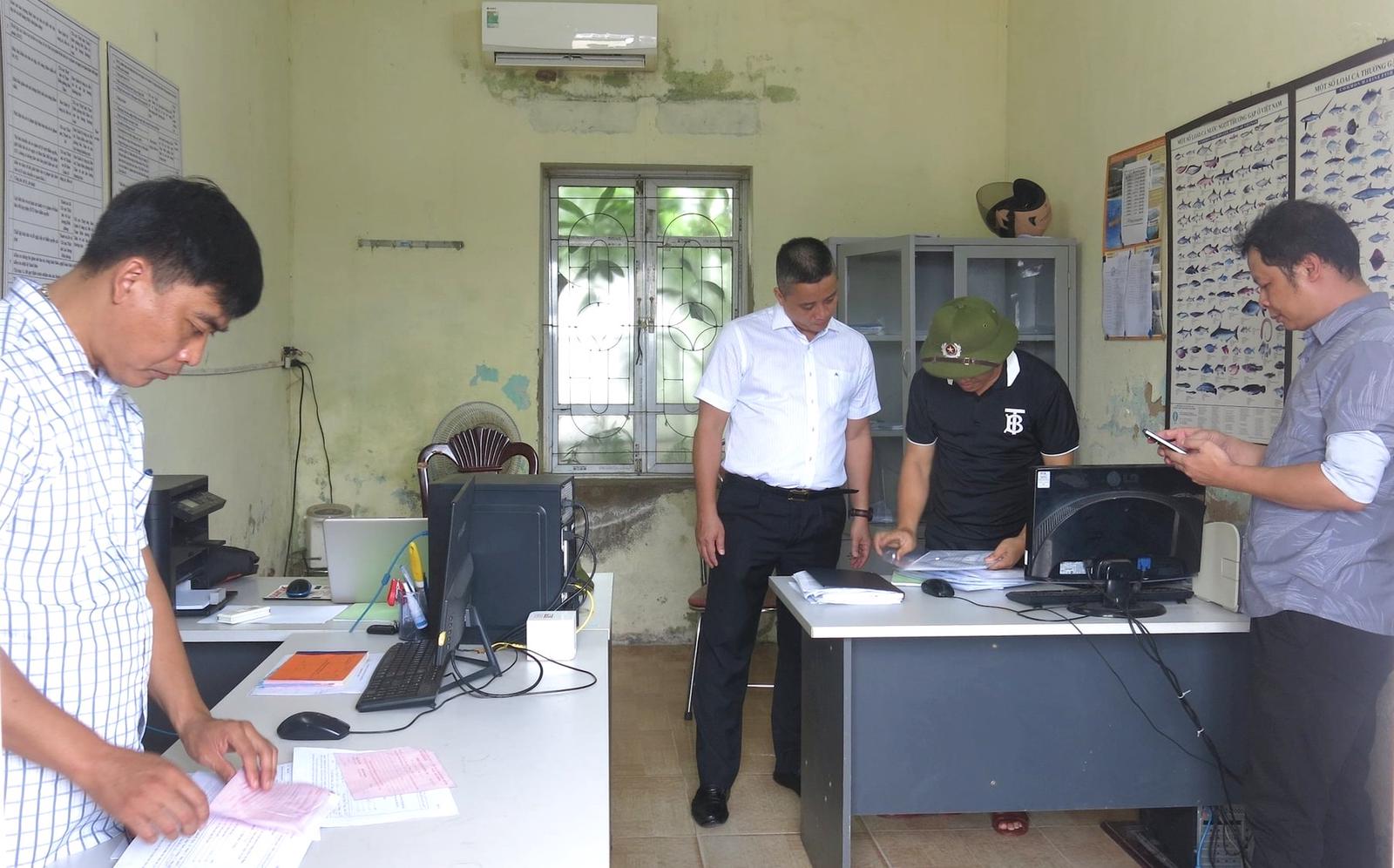 Cán bộ Ban Quản lý bến cá Ngọc Hải kiểm tra hồ sơ, giấy tờ thực hiện nhiệm vụ chống khai thác hải sản bất hợp pháp. Ảnh: Hương An