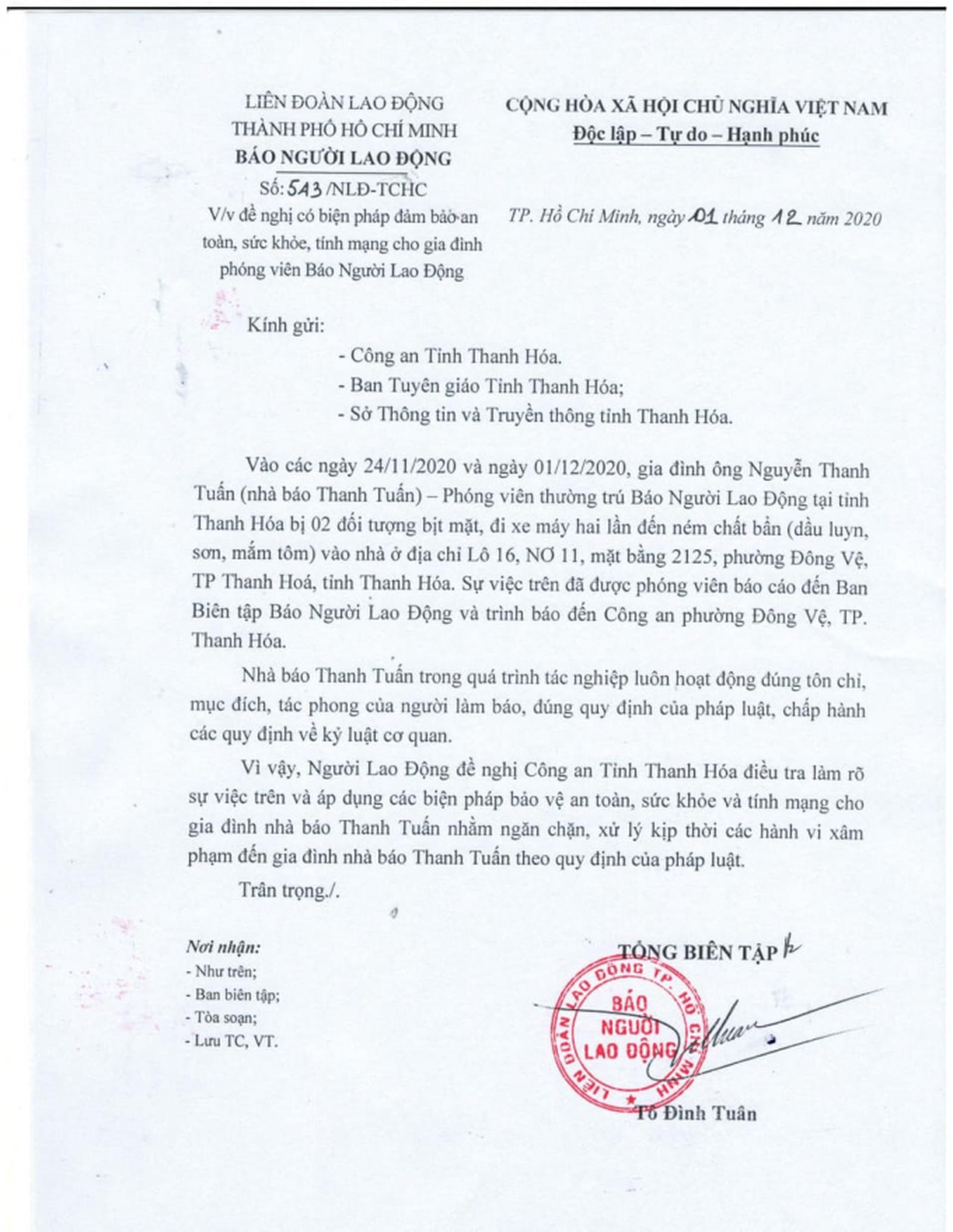 Văn bản Báo Người lao động gửi các cơ quan chức năng tỉnh Thanh Hóa đảm bảo an toàn cho gia đình nhà báo Thanh Tuấn. Ảnh: VT